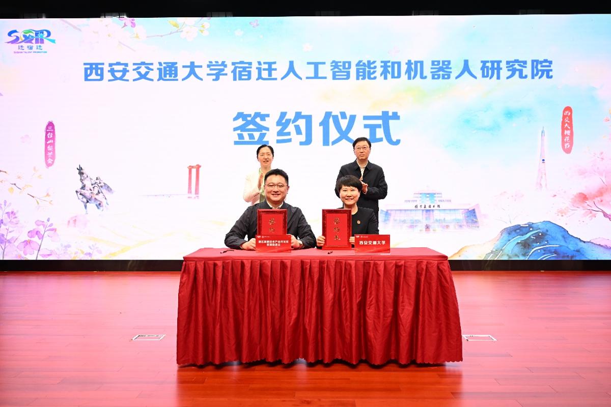 王欢、宿迁市宿豫区委书记徐源代表双方签署共建“西安交通大学宿迁人工智能和机器人研究院”协议。张立群、盛蕾见签。