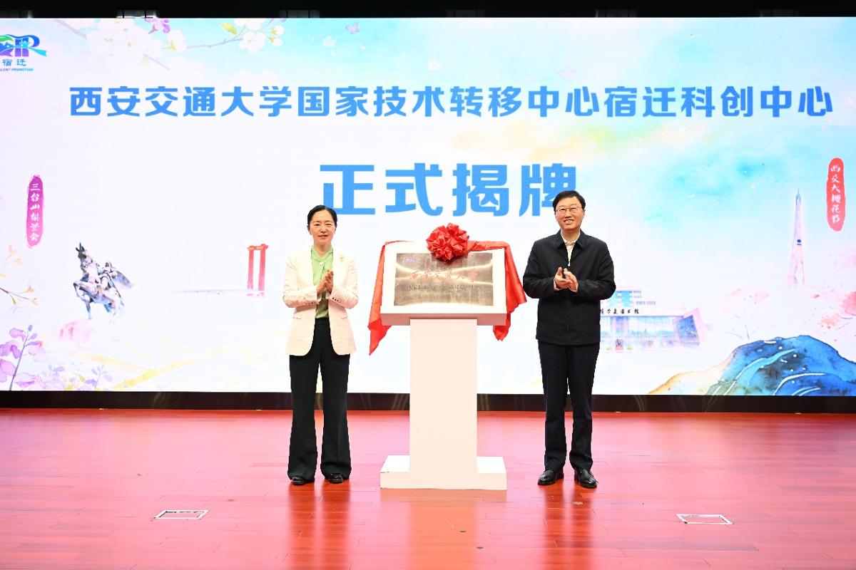 张立群、盛蕾为“西安交通大学国家技术转移中心宿迁科创中心”揭牌。