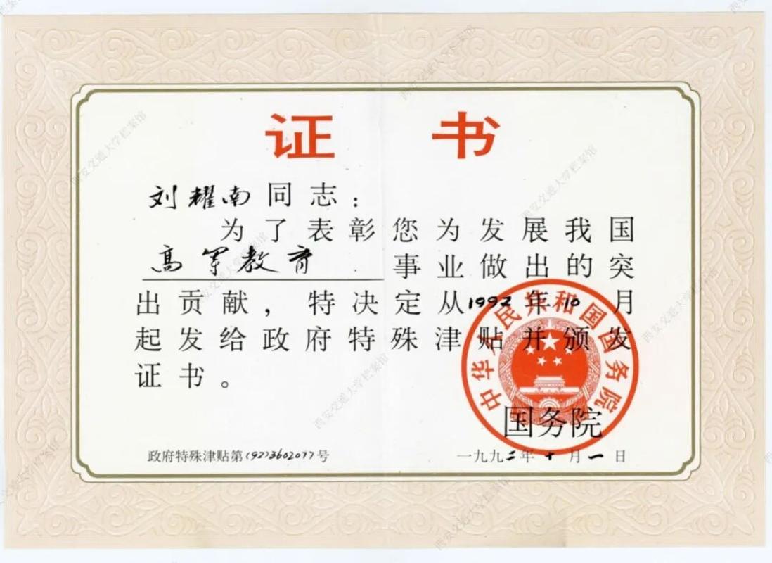 刘耀南获国务院颁发的“政府特殊津贴”证书