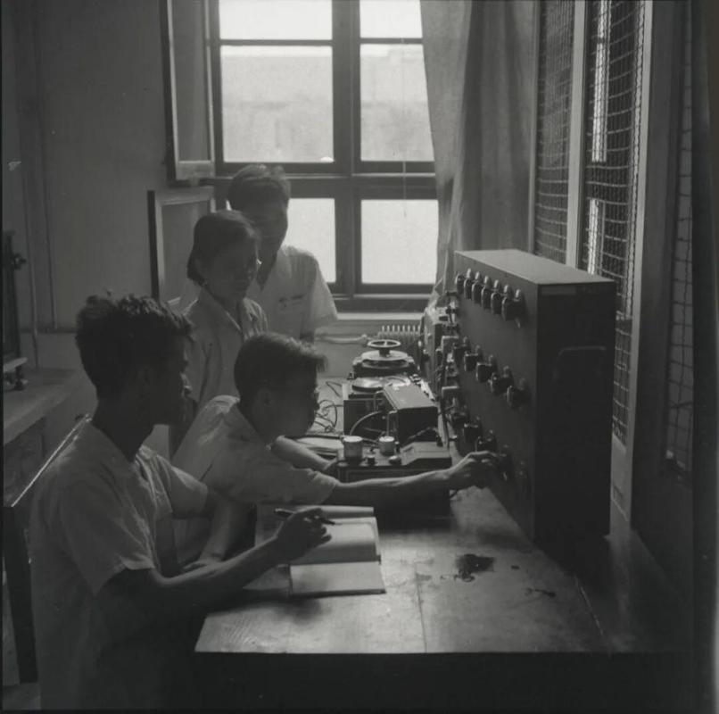 刘耀南(左三)指导学生做实验(摄于1959年)