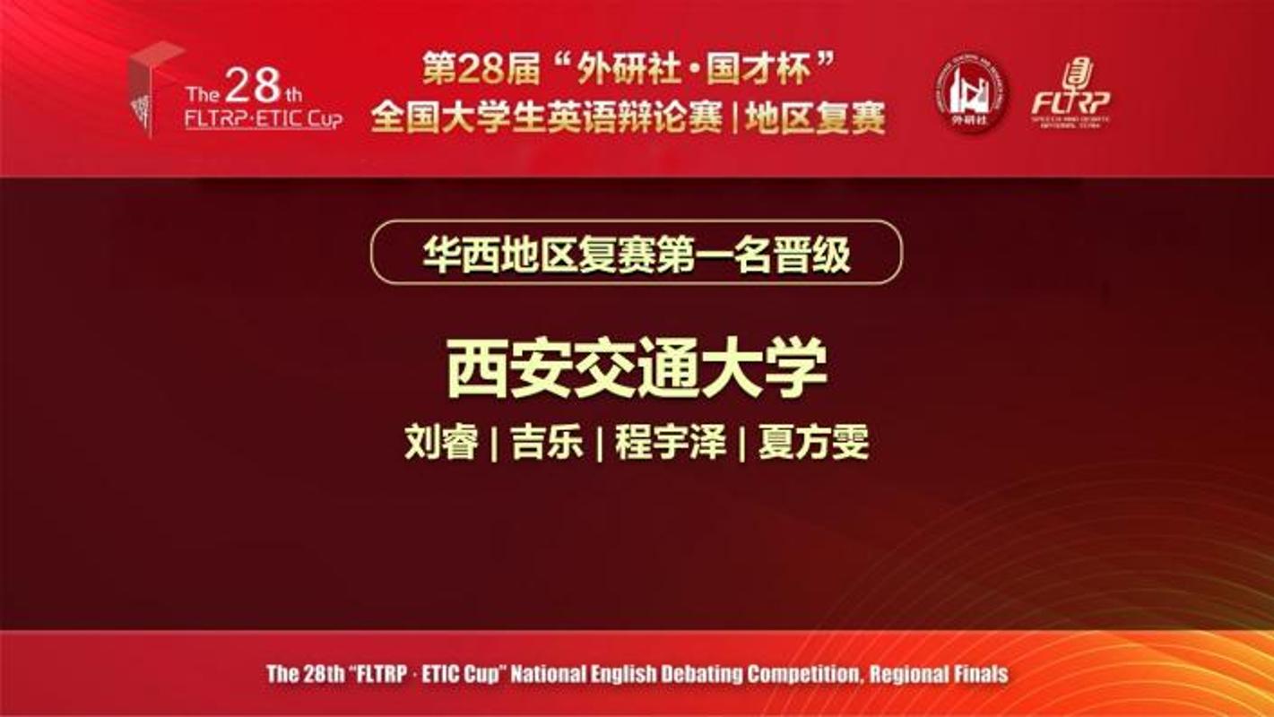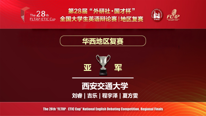 4月18-19日,第二十八届“外研社·国才杯”全国大学生英语辩论赛华西赛区复赛举行。本次复赛汇集了来自陕西、四川、重庆、甘肃等11个省、自治区、直辖市的80余所高校的116支队伍。经过五轮循环赛的激烈角逐,西安交大选手程宇泽、夏方雯(刘睿、吉乐老师指导)以循环赛总分第一名的成绩晋级全国总决赛,在华西赛区总决赛中斩获亚军(特等奖)。今年6月,两位辩手将代表学校出征全国总决赛。