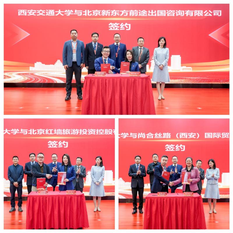 依托跨文化教育研究院,学校与北京新东方前途出国咨询有限公司、北京红墙旅游投资控股有限公司、尚合丝路(西安)国际贸易有限公司三家优秀企业携手签约,聚力打造跨学科、跨领域、跨行业的协同创新平台,助力国际产教融合与国际化人才培养提质增效。