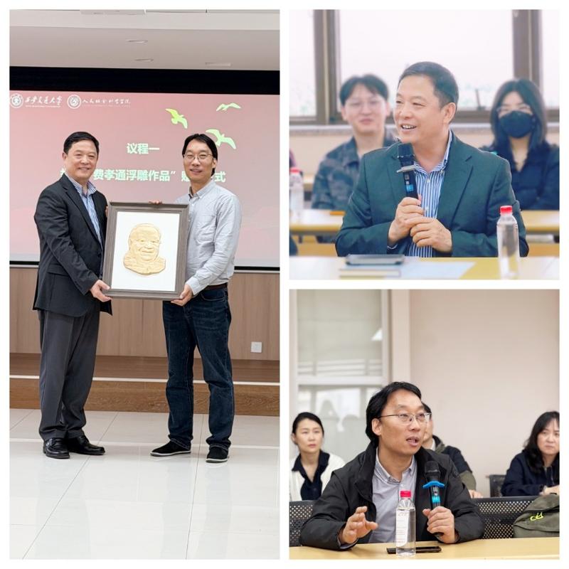 抚今追昔,深情回顾了费孝通先生的学术风范。结合南开班求学与香港科技大学共事经历的珍贵回忆,边燕杰教授系统梳理了费老与西安交大社会学学科的深厚渊源,细数往昔温暖点滴。他高度赞扬了苗祥瑞老师精湛的创作技艺与无私的奉献精神,并以“师生相济、一脉相承,党引方向、校院飞腾”十六字寄语,勉励大家继承先贤遗志,推动学科发展。苗祥瑞介绍了创作心路,表达了对佳作落户实证社会科学研究所的欣慰,并期待两系以此为契机,深化交流,友谊长存。