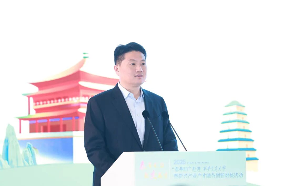 姜冬冬代表泰州市委、市政府对西安交大给予的大力支持表示衷心感谢。他简要介绍了泰州经济社会发展情况,他表示,近年来,泰州抢抓“一带一路”和长三角一体化发展的战略机遇,加快建设产业科创强市,全力打造以“大海新晨”为标志的现代化产业体系。近日,泰州队勇夺“苏超首冠”,生动诠释了泰州“三个不相信”的城市精神特质,积极向上、勇于超越的城市风貌。西安交大是一座为民族复兴而生、以西迁精神铸魂的百年学府,培育出一大批国之栋梁,铸就了无数的科研辉煌。泰州与西安交大结缘已久、合作紧密,诚挚邀请各位交大学子从心爱的“仙交大”来到江苏的“凤凰城”,开启属于自己的“星辰大海”。如果选择来泰就业,国家重点实验室等高端平台为你敞开,3万家优质企业“职”等你来;如果选择来泰创业,我们提供最高1亿元的人才专项扶持、单项2000万元的重磅资助;如果选择在泰生活,人才服务私人订制,“凤城英才卡”一卡通享,为你破解“落脚地”“另一半”“下一代”等成长烦恼。热切期盼能有更多与西安交大通力合作、通赢未来的宝贵机遇,让泰州的产业沃土与交大的科研根系共生共荣,结出更多的金色硕果。