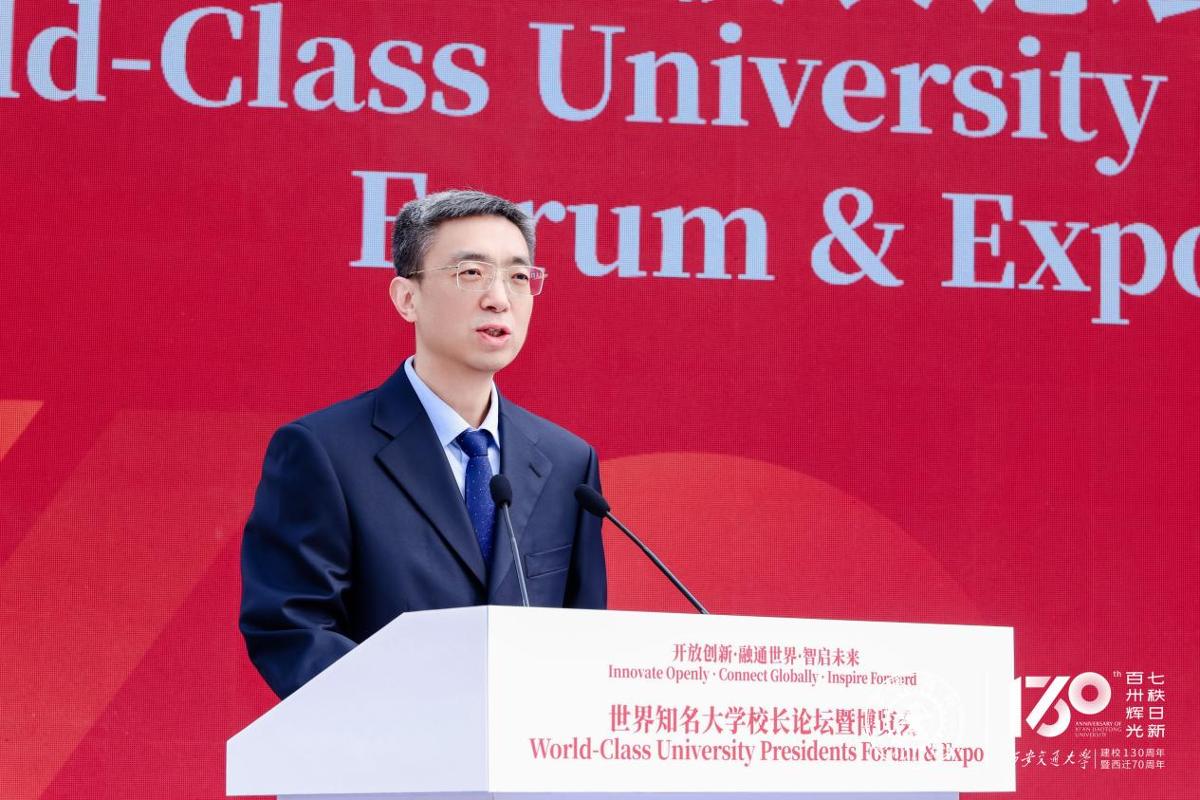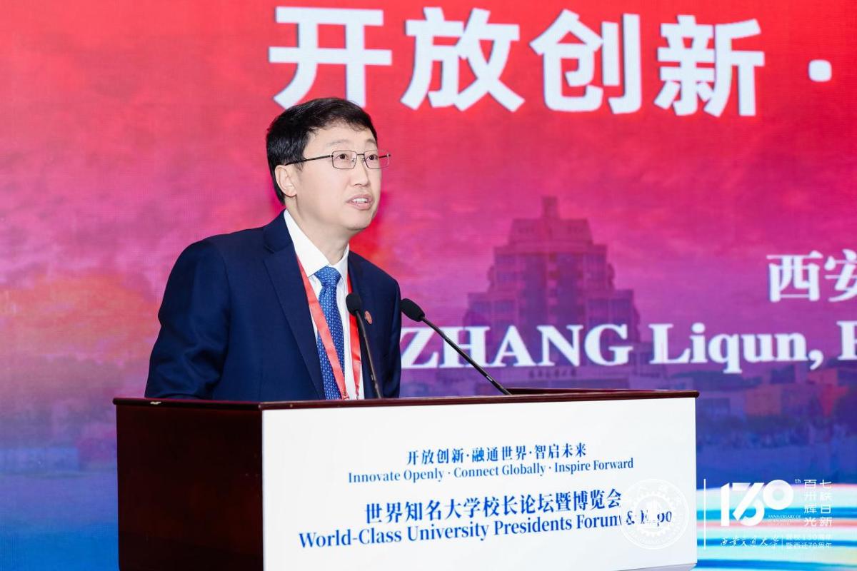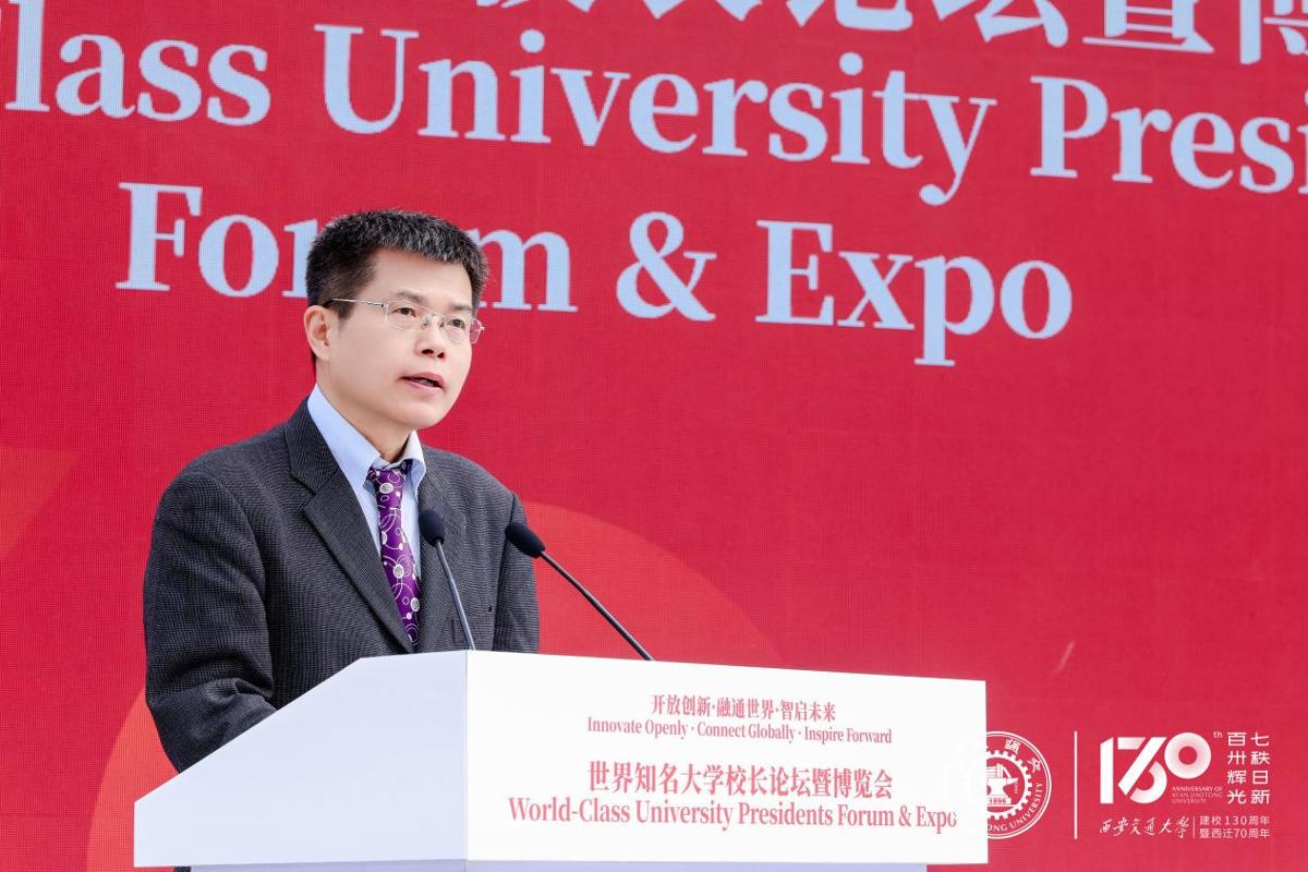 张立群在致辞中回顾了西安交大兴学强国、艰苦创业的辉煌历程。他表示,从1896年南洋公学肇始,到1956年响应国家号召主体西迁,学校始终与国家民族同向同行。建校以来,学校培养了200余位两院院士及大批治国英才,动力工程及工程热物理、电气工程等学科排名全球前列。近年来,学校坚持开放办学,已与近300余所世界高水平大学开展务实合作,首倡发起的“丝绸之路大学联盟”已吸引45个国家和地区的207所大学加盟。此次博览会,不仅是一次高校成果的展示,更是一次思想的碰撞、友谊的连接、文明的交融。希望通过这次大会,各高校相互交流,为世界高等教育的高质量发展,为构建人类命运共同体贡献更多的智慧和力量。