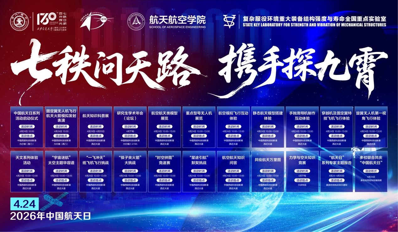 在以“七秩问天路 携手探九霄”为主题的第十一个“中国航天日”即将到来之际,为全面组织落实“中国航天日”推广活动,弘扬航天人自主创新、自强不息、艰苦奋斗、勇攀高峰的精神,激发交大学子弘扬爱国奋斗精神,以航天英雄为榜样,不断攀登新的科学高峰,西安交通大学拟于2026年4月24日至4月30日举办以“七秩问天路 携手探九霄”为主题的“中国航天日”系列活动,具体活动安排如下:
