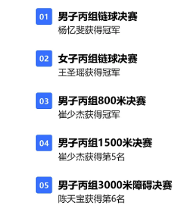 中长跑赛道上,耐力与意志交织书写坚持。崔少杰最后冲刺,奋勇争先,在800米决赛中以1:55.67分的成绩夺得冠军,在1500米决赛中以4:02.37分的成绩获第五名,陈天宝顽强拼搏,在3000米障碍决赛中以10:05.41分的成绩获第六名。