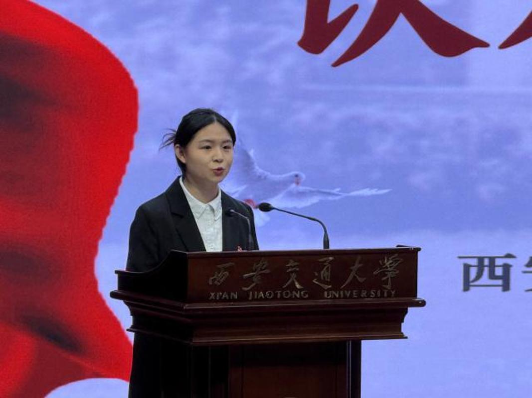 学生微宣讲团宣讲人赵晨作题为《烽火弦歌不辍 饮水思源长流》的示范宣讲。她回顾了交通大学在抗战烽火中西迁办学、弦歌不辍的峥嵘历史,深刻阐释了“天下交大是一家”的“饮水思源”传统与“西迁精神”一脉相承的爱国主义底色,激励在场学子赓续精神血脉,将个人奋斗融入强国伟业。