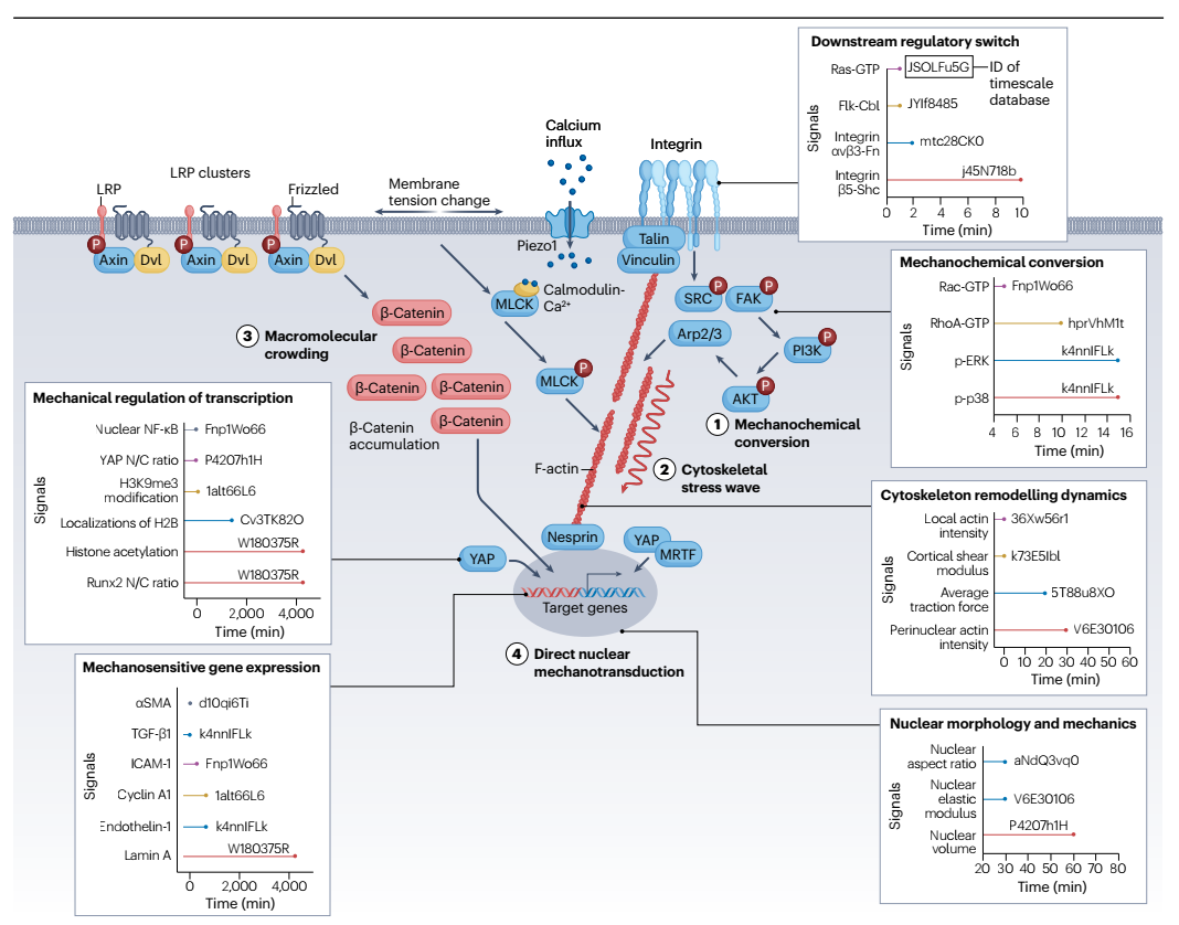 在生物学和医学研究中,力学信号(如压力或拉伸)如何影响细胞行为是一个关键问题。但现有研究往往只关注某个时间尺度,比如毫秒级的快速反应或跨年度的长期变化,缺乏将不同时间尺度整合起来的系统性分析。这导致我们无法全面理解力学信号从触发到最终影响细胞功能的完整过程,从而限制了在组织发育、疾病防治等方面的应用。