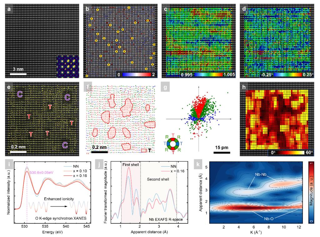 首次揭示“电子云极化”的关键作用。通过同步辐射X射线吸收谱(XAS)与高角环形暗场扫描透射电镜(HAADF-STEM),研究团队首次在介电材料中观测到亚埃级电子云位移,并证明其通过增强Nb–O键离子性、均匀化键长分布,显著提升了极化切换速度与储能效率。