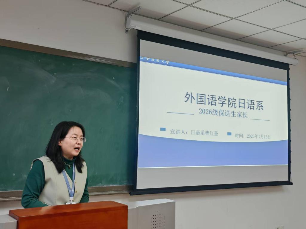 外国语学院院长陈向京教授向学生家长介绍了西安交通大学的悠久历史,详细阐述了交大外语学院在跨学科融合方面的专业优势与特色,并对保送生本科阶段的培养方案与新的专业发展方向进行了全面解读,为保送学生勾勒出一幅清晰的学业蓝图。她表示,西安交大为所有学生提供全面、优质的学习和深造平台,期待在西安最美的金秋九月再次与大家相见。日语系和法语系系主任分别从历史、师资、就业前景等方面介绍了各自的专业实力和特色。