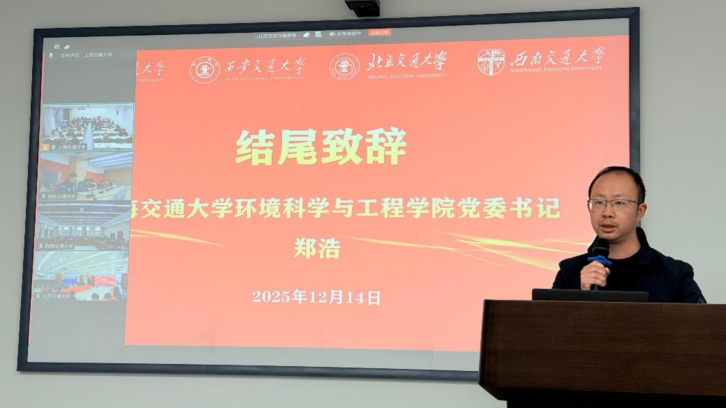 12月14日,四所交大联合开展“聚‘交’青年担使命,联学‘两山’启新程”党建联学共建活动。上海交通大学环境科学与工程学院党委书记郑浩、西安交通大学人居环境与建筑工程学院党委书记杨鹏、北京交通大学环境学院党委书记向宏军、西南交通大学环境科学与工程学院党委书记甘霖出席本次活动,四校13个党支部共计200余名党员参加。西安交大线下分会场由人居学院2025级建筑与环境专硕党支部书记张博主持。