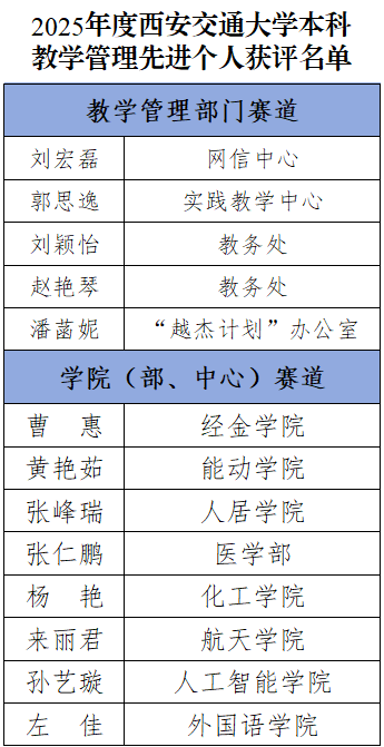 经过现场紧张激烈的候选人答辩和专家评审,综合学生评价和同行评价得分,刘宏磊等5位学校教学管理部门工作人员、曹惠等8位学院(部、中心)教学管理工作人员获评“2025年度西安交通大学本科教学管理先进个人”称号。