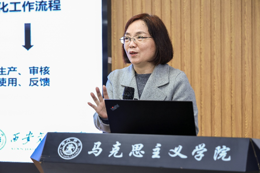 研讨会上,西安交通大学马克思主义学院郑冬芳教授代表课程组汇报教学创新中心相关工作。中心成立以来,组织多场集体备课会,开发了优质教学课件、视频、微型PPT,编写了课程教学资料,探索数字技术赋能教学;开发新时代伟大变革案例,积极推广教学资源,持续助力研究生思政课建设。