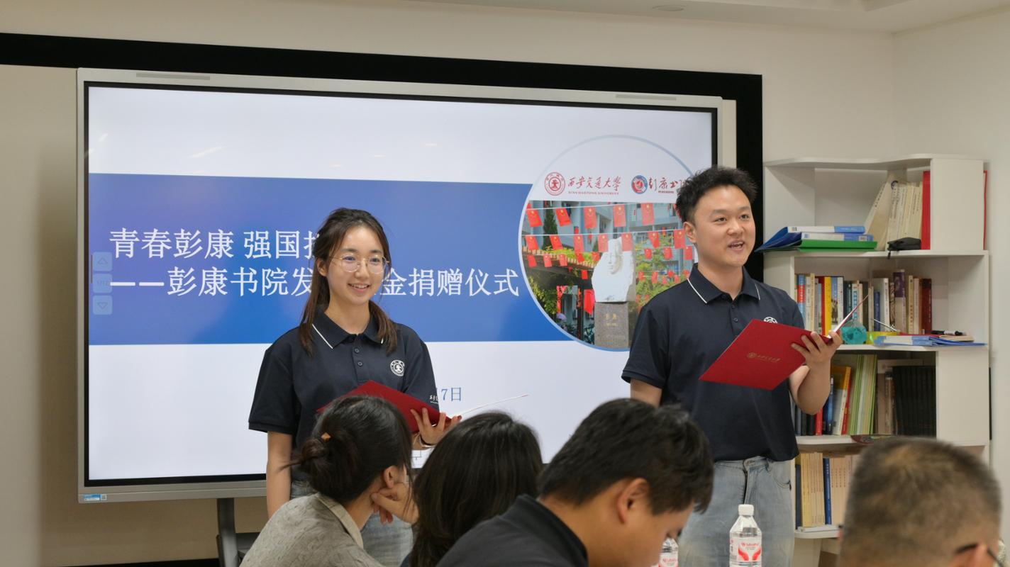 4月7日下午,彭康书院发展基金捐赠仪式举行。彭康书院党总支书记、院务主任叶明,江西华健电力工业有限公司董事长彭世健,彭康校长之孙彭雪飞,西安交通大学校友会工作人员张鑫以及江西华健电力企业代表、彭康书院师生代表参会,仪式由彭康书院教工党支部书记、院务副主任胡欢主持。