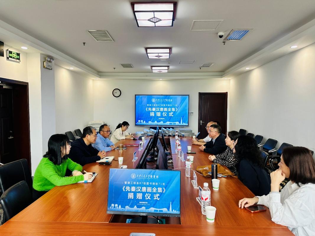 杨峰对校友们的慷慨捐赠表示衷心感谢,同时代表图书馆向校友颁发了收藏证书,并介绍图书馆近年来的发展成果。他讲到,西安交通大学图书馆作为学校文化传承与学术支撑的重要阵地,一直致力于收藏高水平、高价值的文献资源。《先秦汉唐画全集》的入藏,不仅极大丰富了图书馆在艺术文献领域的馆藏,也为相关学科的研究提供了第一手权威图像资料。魏青山表示,图书馆将妥善保管、充分利用这套珍贵典籍,让其在教学、科研和文化育人中发挥最大价值。李凌、张一翠就图书的编目、上架及后续展示利用与校友们进行了交流。