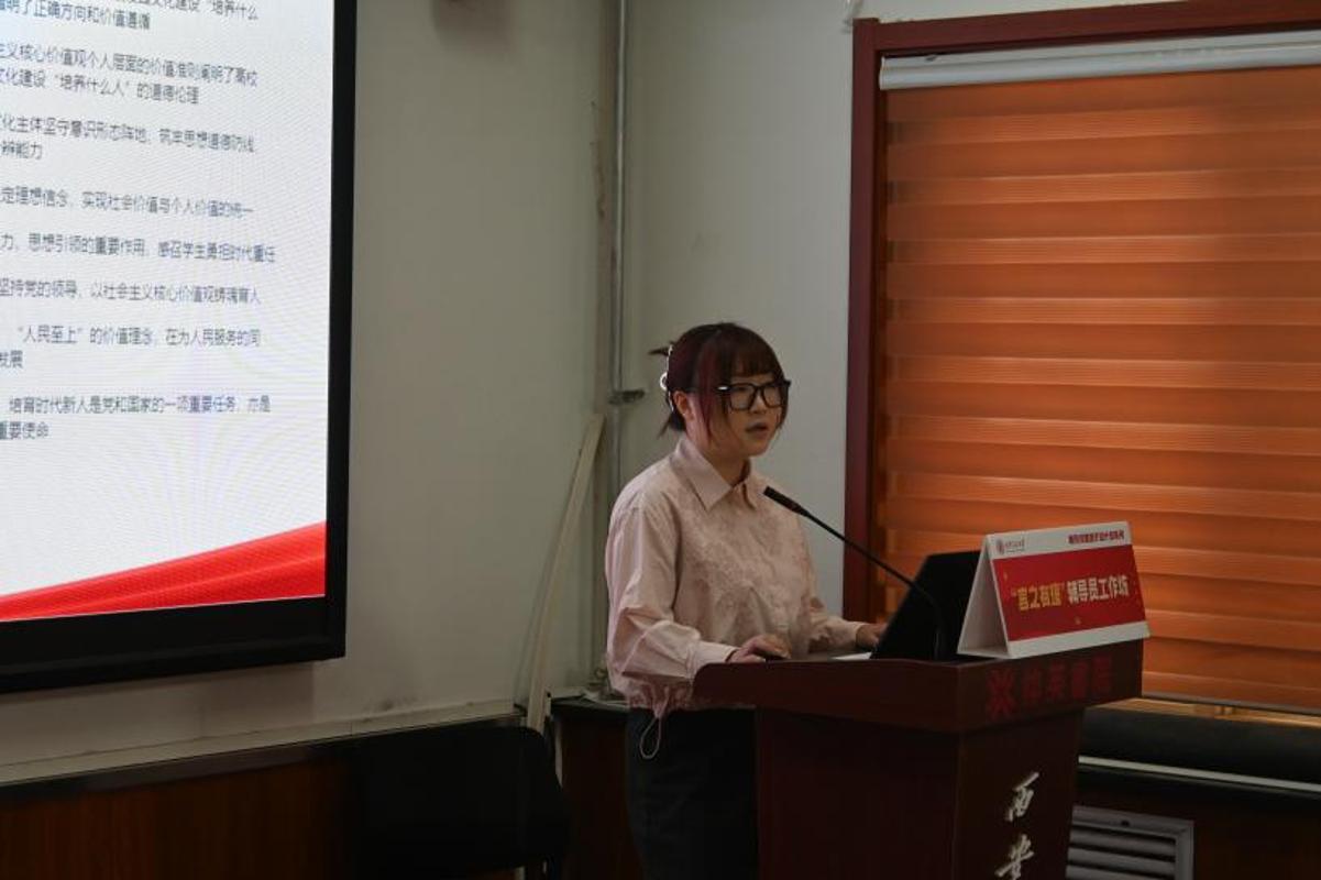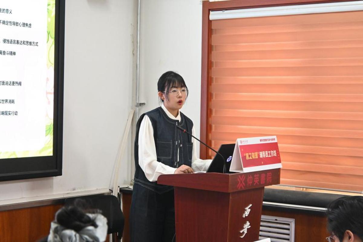 励志书院东诗雨以“以文化人,行胜于言,用社会主义核心价值观引领文化建设的实践与思考”为题,深入阐释核心价值观引领文化建设的理论逻辑、实践逻辑与育人逻辑,指出辅导员应坚持把价值导向融入日常管理、把品格养成融入实践体验、把精神滋养融入成长全过程,实现以文化人、以文育人。