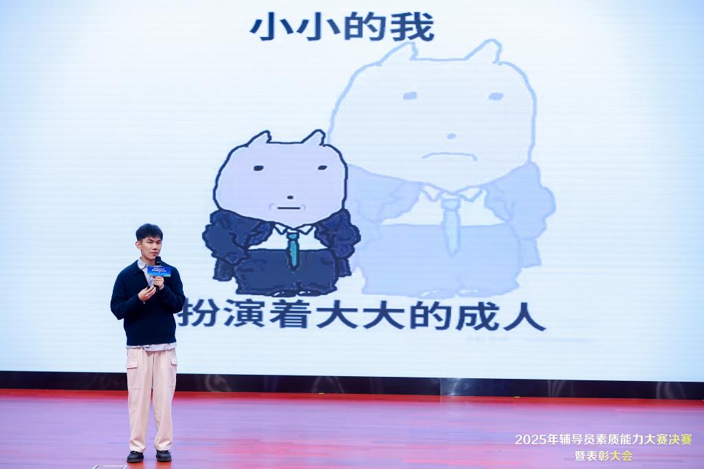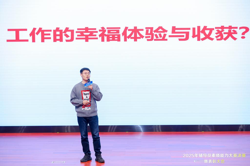 决赛现场,参赛辅导员们为对应的助演学生送上了一份特别的纪念礼物。这份赠礼寄托着老师们的期许:希望同学们不仅能理解智能时代的浪潮,更能始终保持思想的深度与情感的温度。助演学生马良驹作为代表发言,他从参与者的独特视角,分享了对辅导员工作的全新认知与真挚感谢。“他们就像宿舍楼里那盏常亮的灯,总在那里守护着我们。”其真切的感悟与生动的比喻,不仅折射出辅导员日常工作的细致温度,更让这场专业竞赛流淌出温暖的人文关怀。