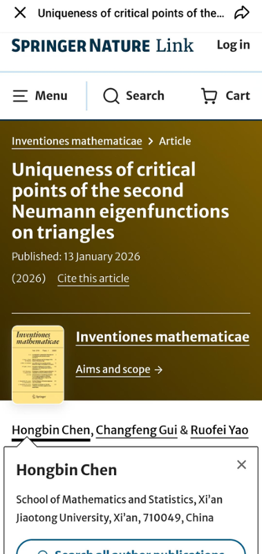1月13日,西安交通大学数学与统计学院陈红斌教授与澳门大学桂长峰教授、华南理工大学姚若飞副教授合作的论文Uniqueness of critical points of the second Neumann eigenfunctions on triangles(《三角形上第二类Neumann特征函数临界点的唯一性》)被世界四大顶尖数学期刊之一的Inventiones Mathematicae(《数学新进展》)在线发表。这是数学与统计学院自2020年以来,第二次有教师的高水平成果在数学四大顶刊上获得接收发表,同时也是西安交通大学及数学与统计学院大力推动基础研究领域取得的又一重要突破。