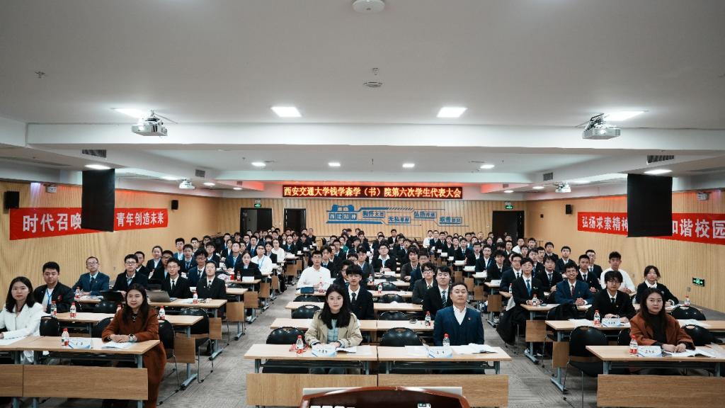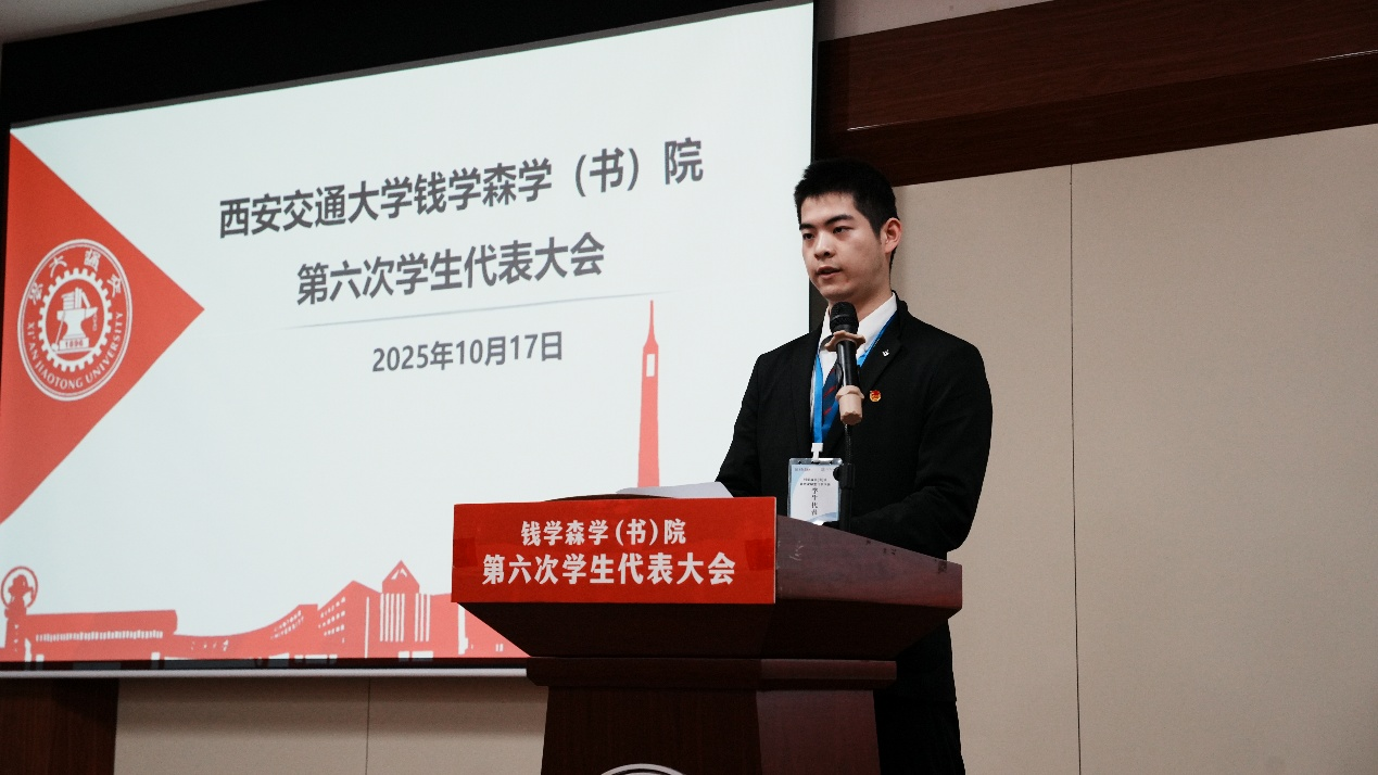 秋意渐浓,细雨如丝。2025年10月17日晚,西安交通大学钱学森学(书)院第六次学生代表大会在仲英楼B102星空报告厅召开。钱学森书院党总支书记、院务主任田博,院务副主任李华,校团委老师张淑涵,书院全体辅导员,西安交通大学学生会主席团成员候选人杨长霖,以及来自各兄弟书院的学生代表出席大会。大会由杜若冰同学主持,87名学生代表齐聚一堂,共商发展大计,共绘成长蓝图。