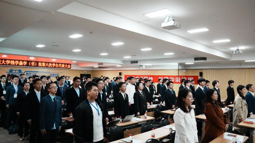 大会最后,全体与会人员起立,奏唱西安交通大学校歌。在激昂的旋律中,钱学森学(书)院第六次学生代表大会圆满落幕。