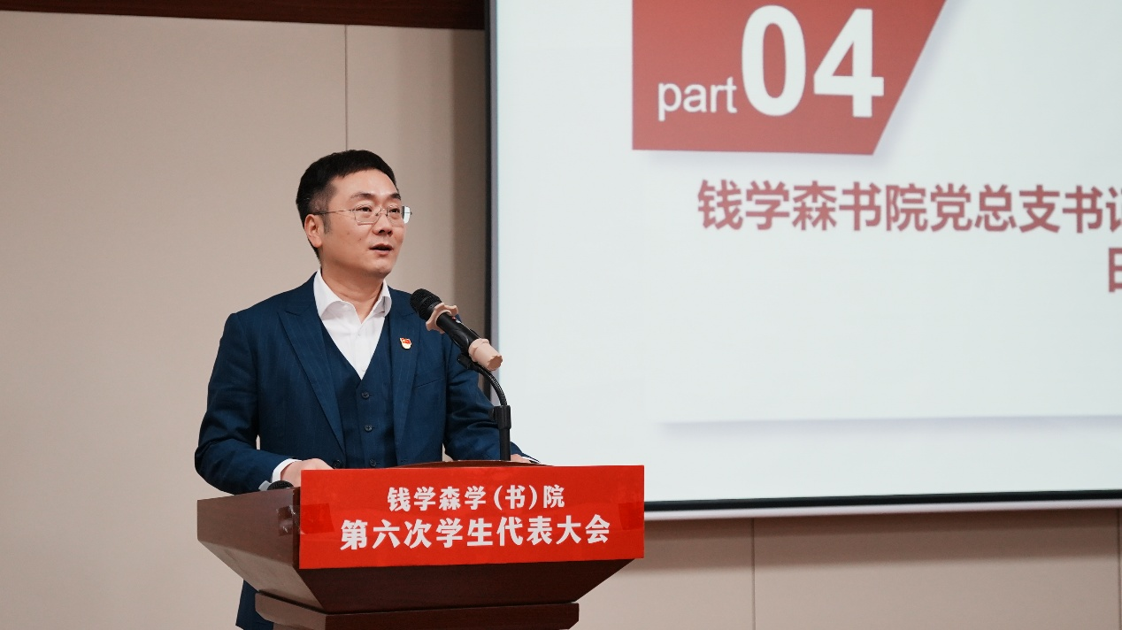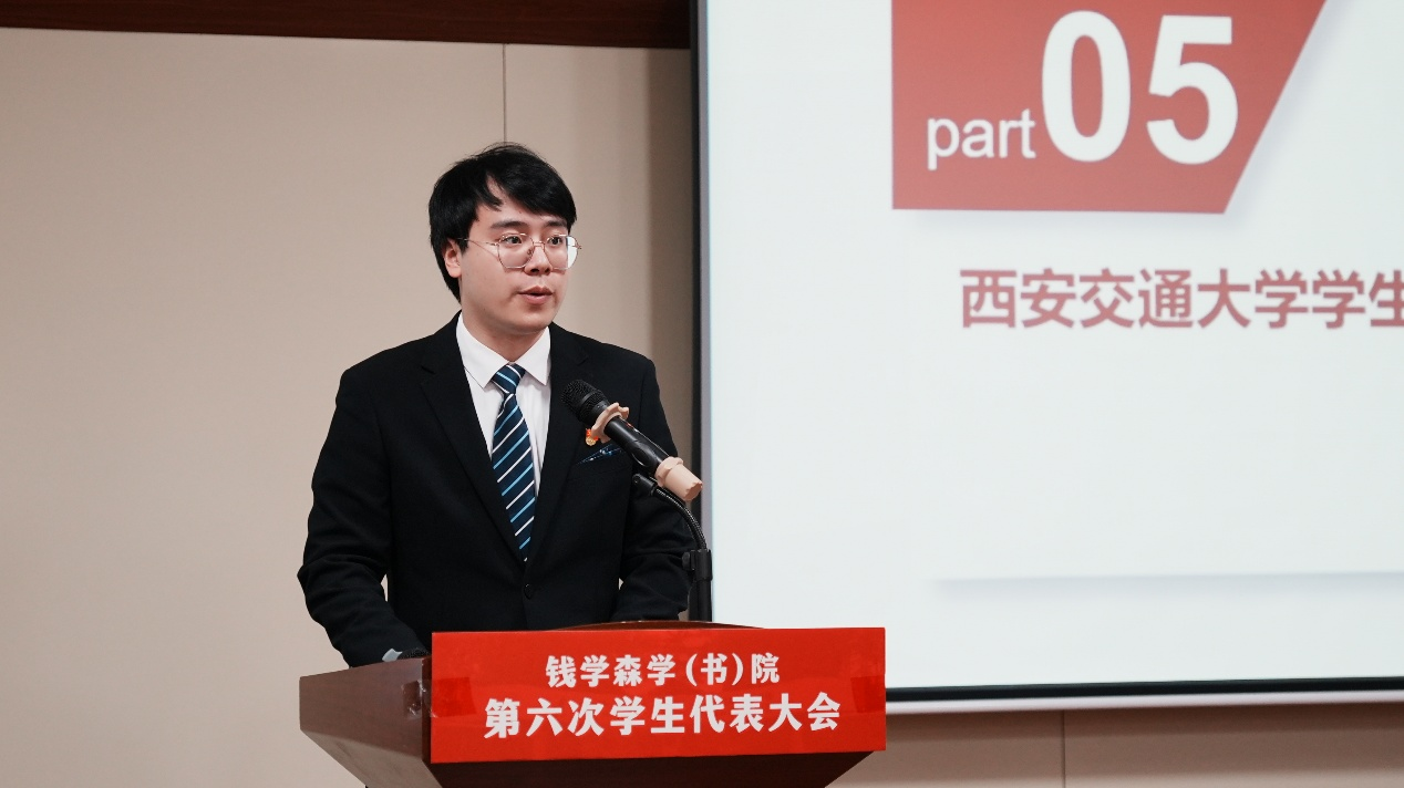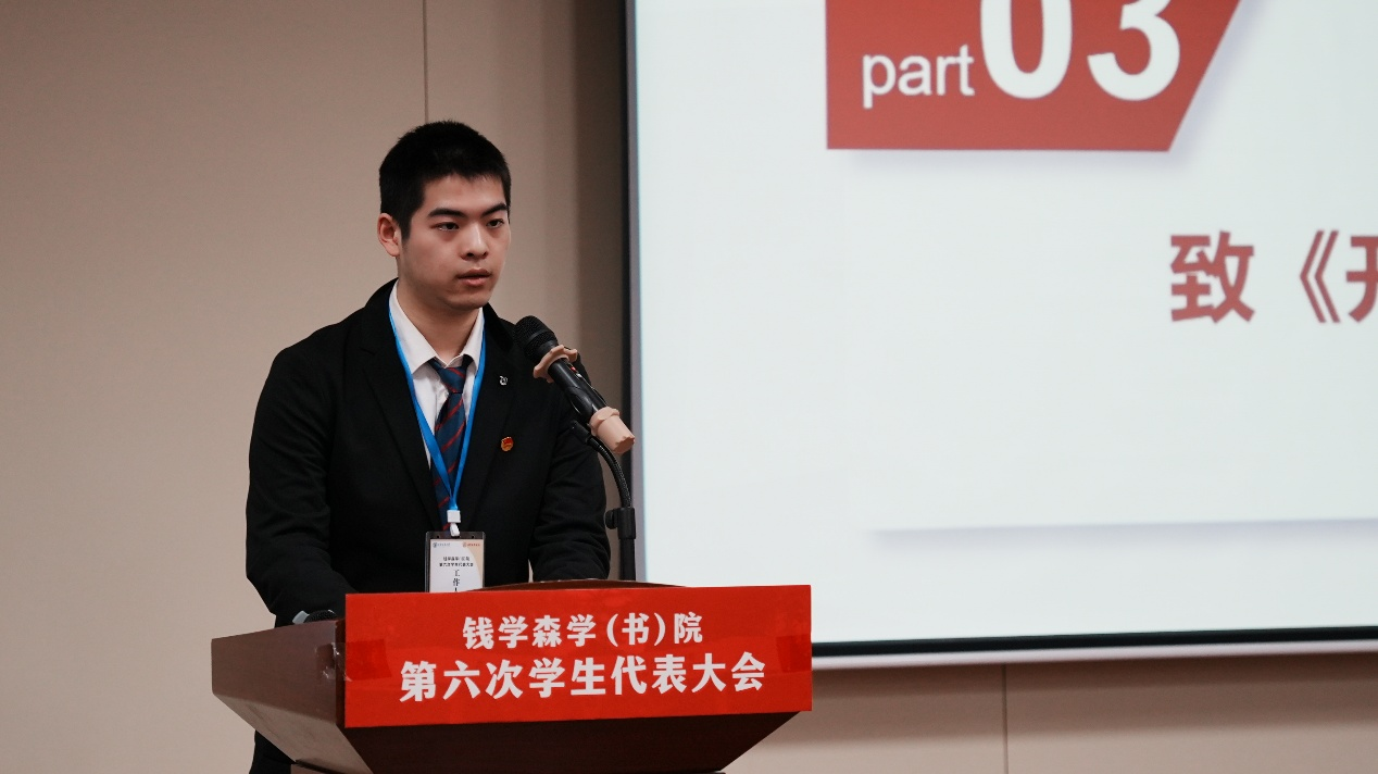杨长霖代表校学生会致辞。他对大会的召开表示热烈祝贺,充分肯定钱学森学(书)院学生会过去一年在思想引领、组织改革、权益服务、文化育人等方面取得的扎实成效。他表示,校学生会将一如既往支持书院工作,希望新一届学生会强化政治引领,传承西迁精神,积极参与“攀登计划”“星航计划”等学校重点部署;深化校-院-班三级联动,推动骨干交叉任职,增强组织活力;始终聚焦同学需求,关注急难愁盼问题,完善线上线下结合的服务体系,切实提升服务实效。
