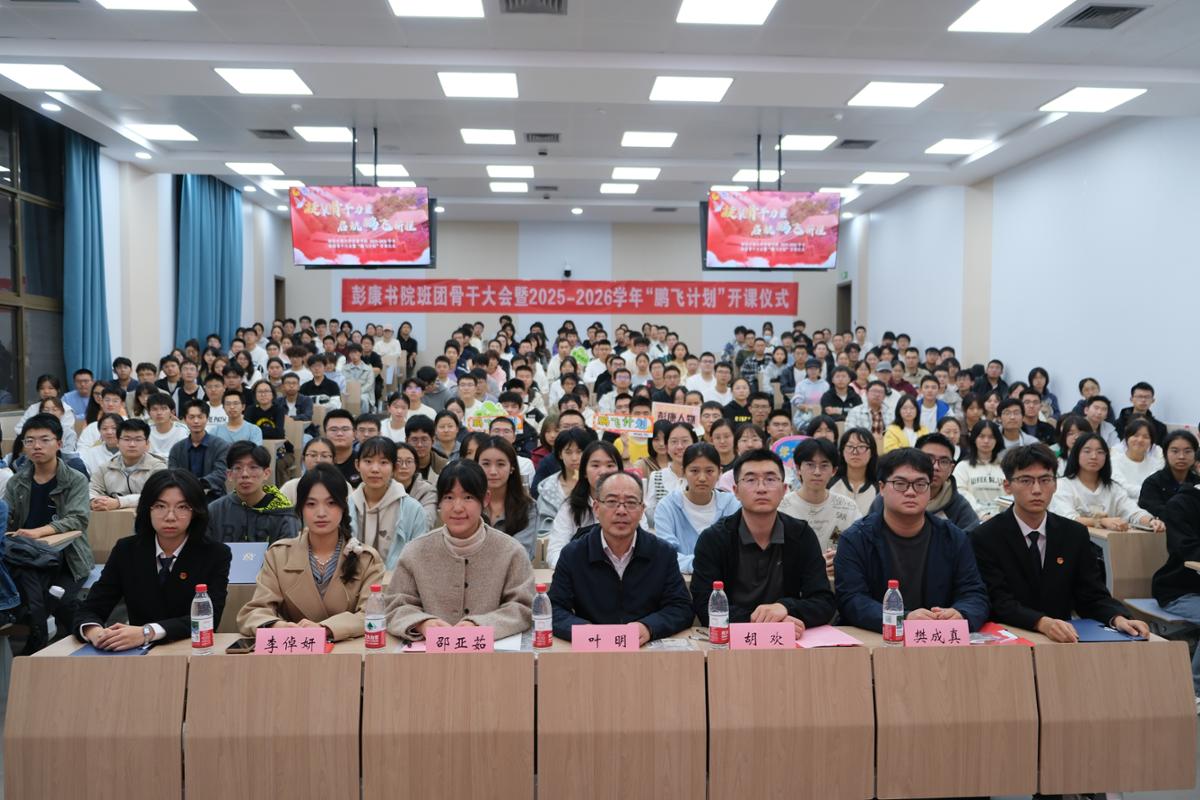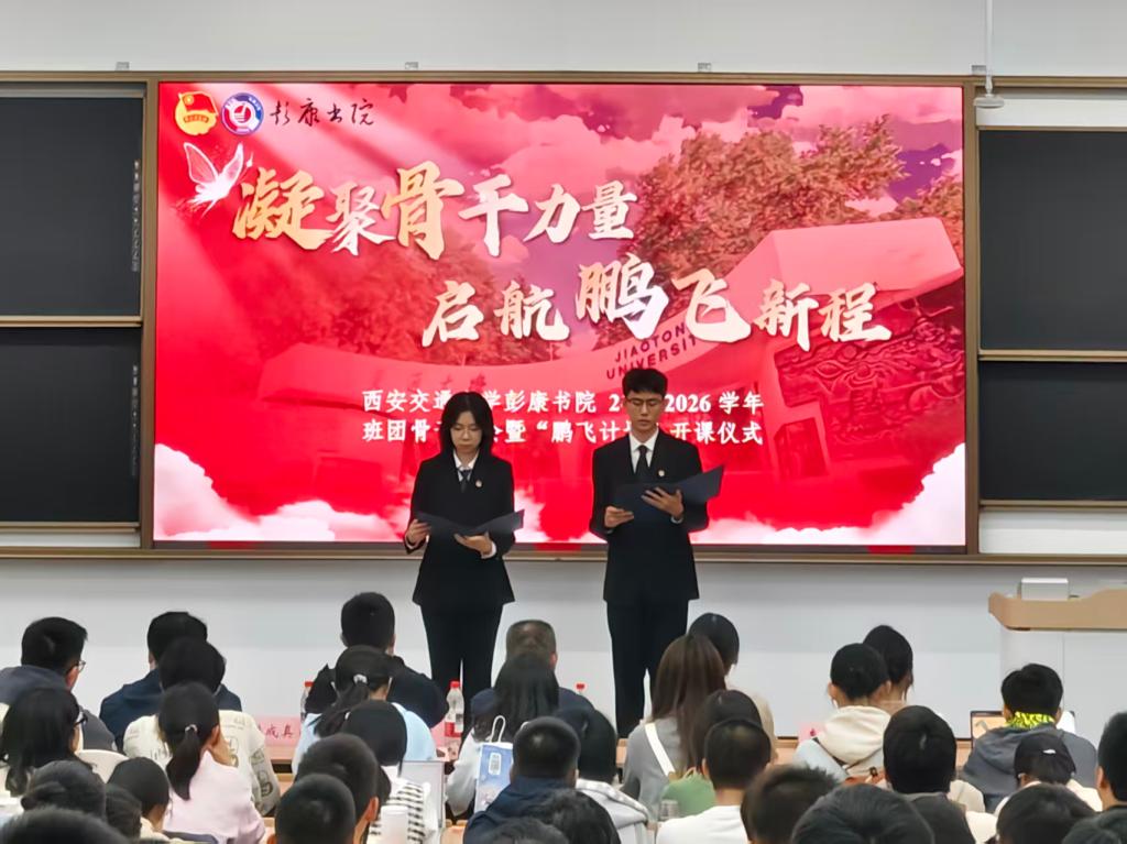 10月15日下午,彭康书院2025-2026学年班团骨干大会暨“鹏飞计划”开课仪式在主A-103举办。彭康书院党总支书记、院务主任叶明,彭康书院教工党支部书记、院务副主任胡欢,彭康书院团委副书记邵亚茹,“鹏飞计划”班主任樊成真,优秀学员代表、西安交通大学优秀学生标兵李倬妍以及彭康书院全体班团骨干、“鹏飞计划”学员参加活动。