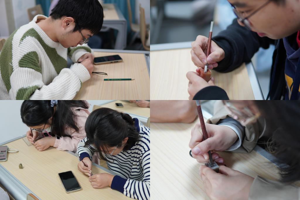 活动伊始,专业老师带领同学们追溯篆刻艺术的千年源流。从先秦古玺到秦汉印章,从实用信物到文人雅玩,详细解读了篆刻艺术“以印言美、以印言志”的文化内涵与“刀情笔趣载千秋讯息”的艺术特质。随后,老师现场解密篆刻工艺,演示石料选择、印面设计、执刀技法等关键步骤,深入浅出地讲解与直观生动地示范,让同学们快速掌握了篆刻的基础要领,跃跃欲试想要亲手创作。