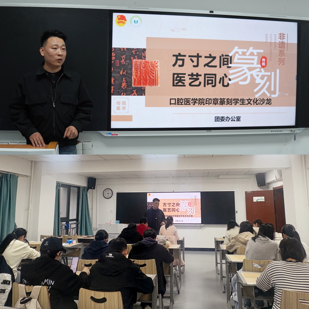 为传承中华优秀传统文化,提升学生审美素养与人文内涵,践行“锻炼口腔医学生灵巧的手”的育人主旨,10月24日下午,口腔医学院团委举办“方寸之间,医艺同心”印章篆刻学生文化沙龙,30余名本硕学生齐聚一堂,在方寸石章间体悟千年篆刻艺术的魅力,共度一段兼具文化韵味与实践乐趣的美好时光。