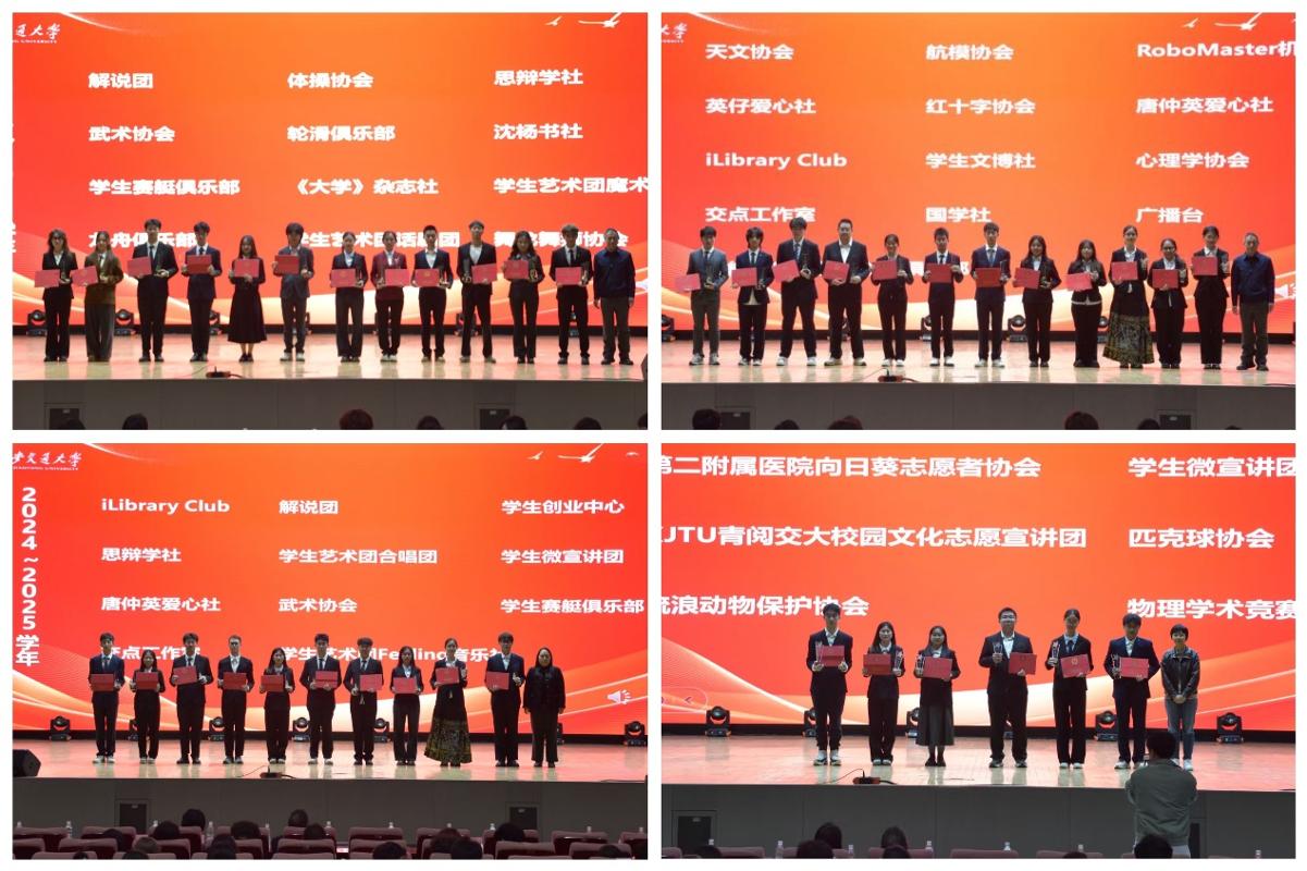 大会表彰了在2024-2025学年的各类活动中表现优异的学生社团。解说团、体操协会、思辩学社等25个社团获评“五星级社团”称号,iLibrary Club、解说团、学生创业中心等22个社团获评“文明社团”称号,第二附属医院向日葵志愿者协会、学生微宣讲团、XJTU青阅交大校园文化志愿宣讲团等6个社团获评“潜力社团”称号。会上同时完成了2025-2026学年学生社团指导中心新一届主任团的聘任工作。
