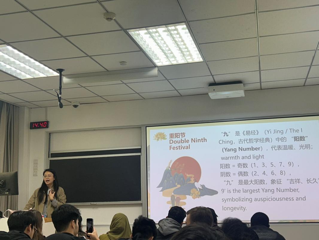 为增强国际学生对这一节日的理解,10月28日下午,国际教育学院特邀请汉语教师刘莹为国际学生举办“情暖金秋,爱在重阳”主题文化讲座,共有来自印度、摩洛哥、伊朗、伊拉克、尼泊尔、柬埔寨、南非、俄罗斯、厄瓜多尔、墨西哥、巴基斯坦哈萨克斯坦等二十余个国家的130余名中外学生积极参加。