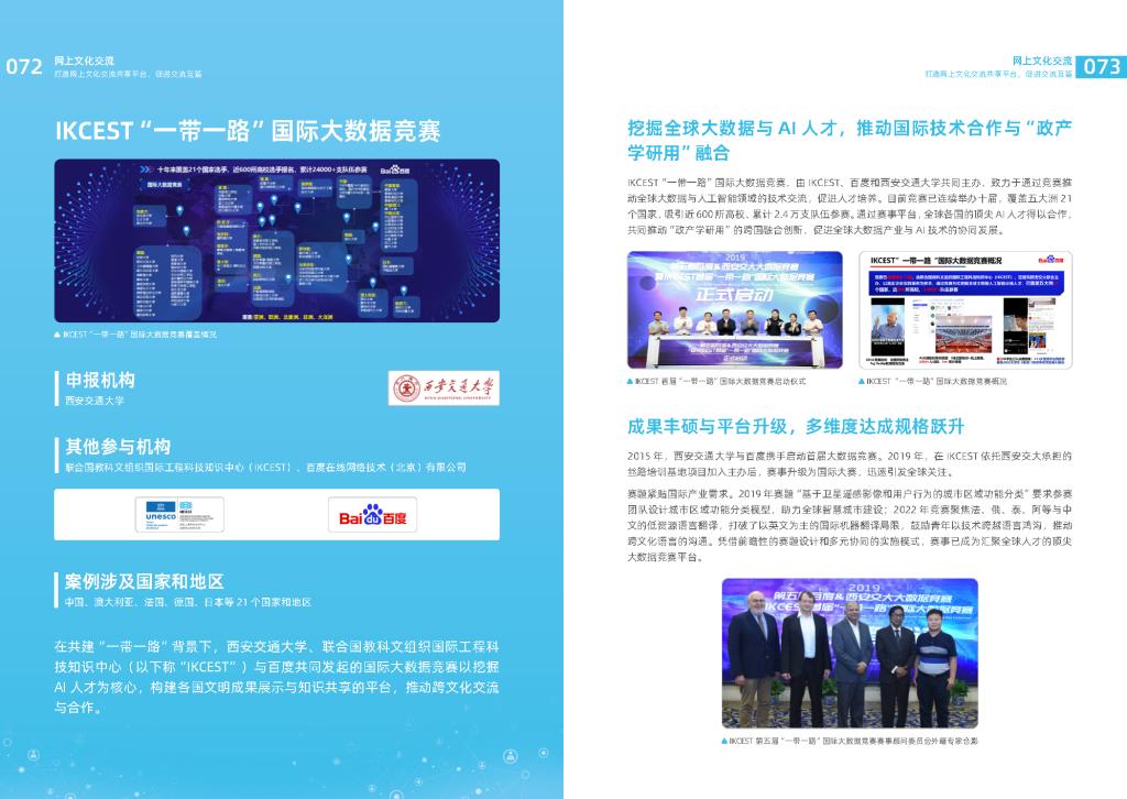 成果丰硕与平台升级,多维度达成规格跃升。2015年,西安交通大学与百度携手启动首届大数据竞赛。2019年,IKCEST加入主办,赛事升级为国际大赛,迅速引发全球关注。赛题紧贴国际产业需求。2019年赛题“基于卫星遥感影像和用户行为的城市区域功能分类”要求参赛团队设计城市区域功能分类模型,助力全球智慧城市建设;2022年竞赛聚焦法、俄、泰、阿等与中文的低资源语言翻译,打破了以英文为主的国际机器翻译局限,鼓励青年以技术跨越语言鸿沟,推动跨文化语言的沟通。凭借前瞻性的赛题设计和多元协同的实施模式,赛事已成为汇聚全球人才的顶尖大数据竞赛平台。