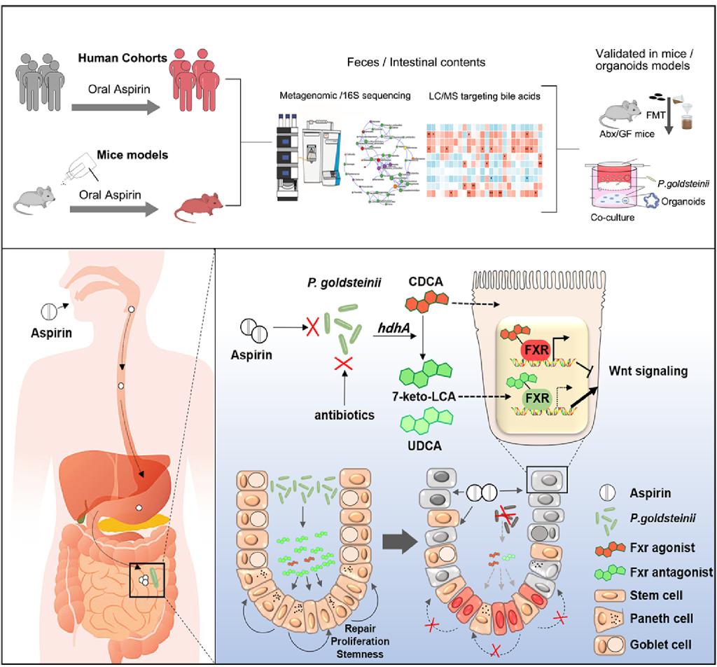 本研究由西安交大一附院袁祖贻教授、吴岳教授、李铤教授以及美国国立医学院Frank J Gonzalez合作完成。团队通过整合分析临床队列多组学与动物实验结果,首次系统揭示了“肠道微生物-胆汁酸轴”在阿司匹林相关肠损伤中的关键保护作用。研究团队鉴定出一种受阿司匹林显著抑制的肠道共生菌——戈氏副拟杆菌(Parabacteroides goldsteinii),及其代谢产物7-酮石胆酸(7-keto-LCA)。后者在维持肠道稳态中发挥重要作用。实验表明,补充戈氏副拟杆菌能显著减轻阿司匹林引起的小鼠肠道屏障损伤。进一步机制研究揭示,7-keto-LCA作为法尼醇X受体(FXR)的拮抗剂,通过抑制FXR信号通路,激活Wnt信号,进而促进肠道干细胞的自我更新与上皮修复。该研究为阿司匹林相关肠病的防治提供了新的微生物—代谢干预思路:通过补充特定的益生菌(如戈氏副拟杆菌)或外源性胆汁酸代谢物,有望恢复肠道微生态平衡,减轻药物性肠损伤。
