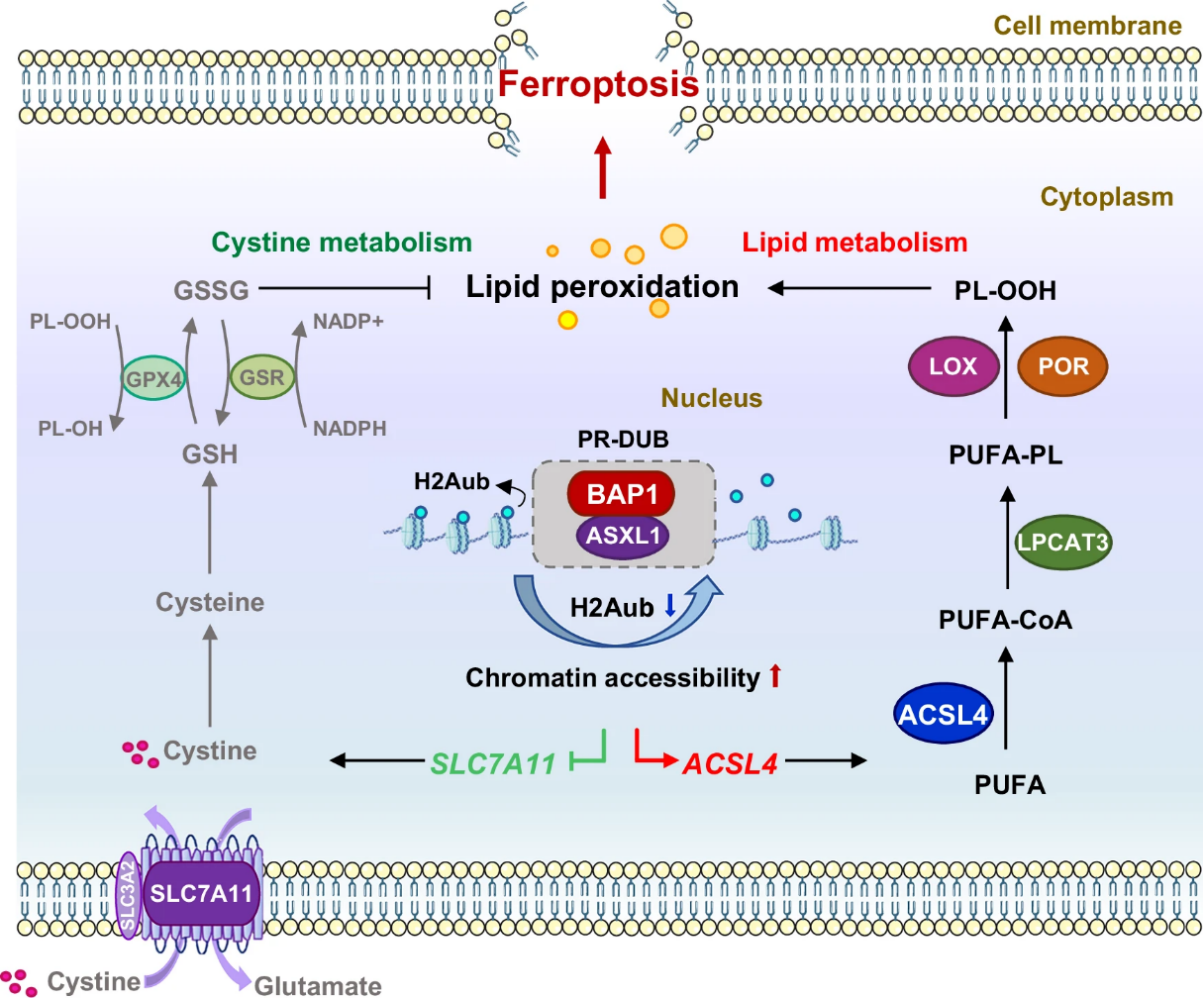 机制研究表明,BAP1通过降低ACSL4基因启动子区域的H2Aub水平,增强其染色质可及性,从而正向调控ACSL4的转录表达。值得注意的是,这一调控过程不依赖于已知的ACSL4转录因子如HIF-1α等,而是由BAP1与ASXL家族蛋白(尤其是ASXL1)形成的PR-DUB复合物所介导。进一步功能实验证实,ACSL4的缺失或药理抑制可显著削弱BAP1过表达所引发的脂质过氧化与铁死亡,即使在SLC7A11缺失背景下亦然,说明ACSL4介导的脂代谢通路是BAP1独立于胱氨酸代谢促进铁死亡的另一关键途径。脂质组学分析进一步揭示,BAP1通过上调ACSL4表达,显著促进多种脂质类别的合成,特别是富含多不饱和脂肪酸的磷脂种类,这些脂质正是铁死亡中脂质过氧化的主要底物。此外,外源添加ACSL4催化产物AA-CoA可部分减弱ACSL4缺失导致的铁死亡抵抗,进一步确认了ACSL4在BAP1调控通路中的重要地位。