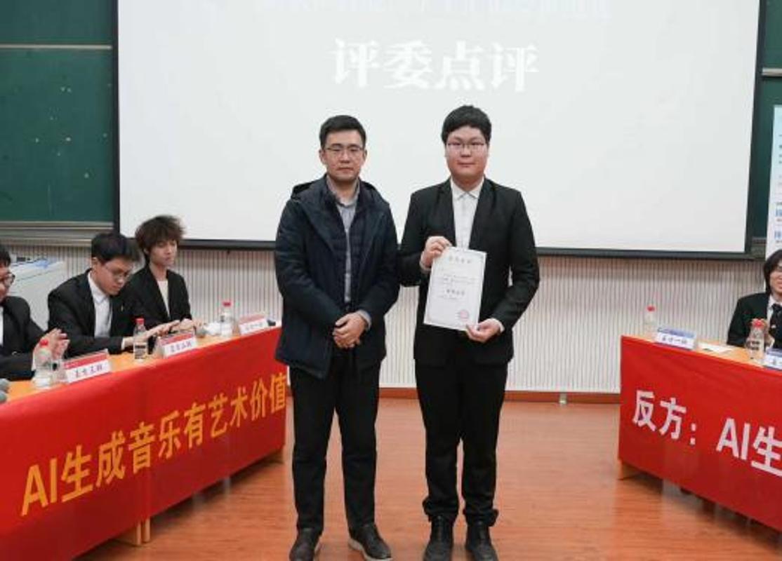 本次活动由刘佩毅同学兼任主持与辩论主席,保障各环节顺畅衔接。现场嘉宾包括国际辩论赛知名教练及评委、人文学院韩鹏杰教授,国际辩论赛知名教练及评委、航天航空学院党委书记张爱萍,《走进音乐人工智能》课程负责人、音乐教育中心曹耿献副教授,电信学部自动化学院李东鹤副教授,以及第二届“国运杯”优秀辩论队队长兼学生培训教练高渝淇同学。