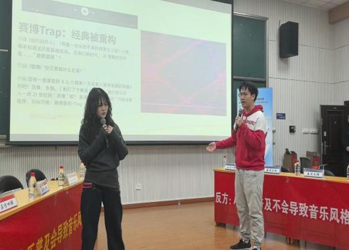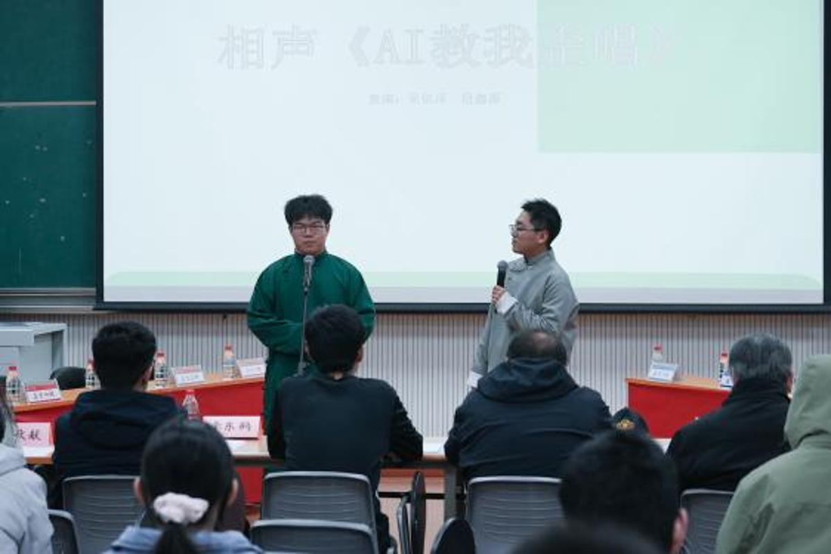 活动开篇的学生交流展示环节颇具创意,成为全场关注的焦点。吴依泽、段鑫源等同学带来的相声《AI教我歪唱》,将传统相声“说学逗唱”的艺术形式与AI辅助创作相结合。他们改编了《知否知否》《孤勇者》《朋友》等经典流行歌曲,融入大学生学习生活中的常见场景,诸如“积分写到愁,算纸堆成小楼”的数学学习调侃,“塑料兄弟情”的趣味互动,既保留了相声的诙谐特色,又展现了AI在歌词创作中的创新应用,引发台下阵阵掌声与笑声。