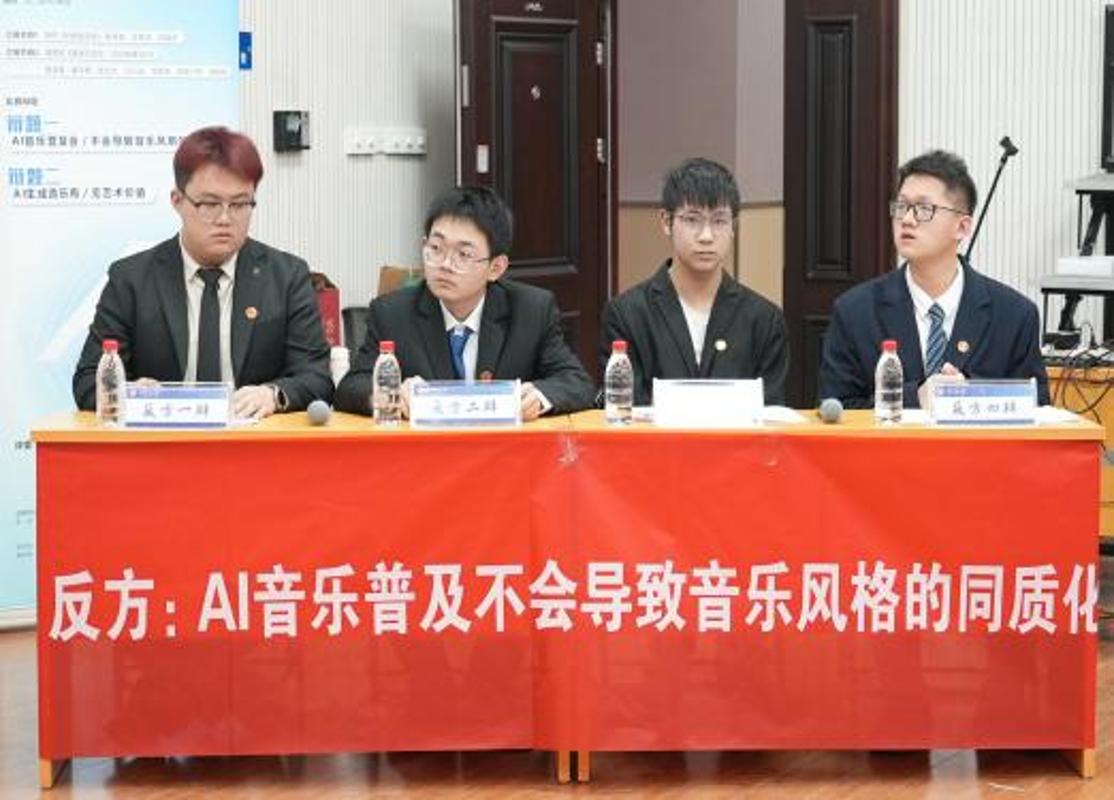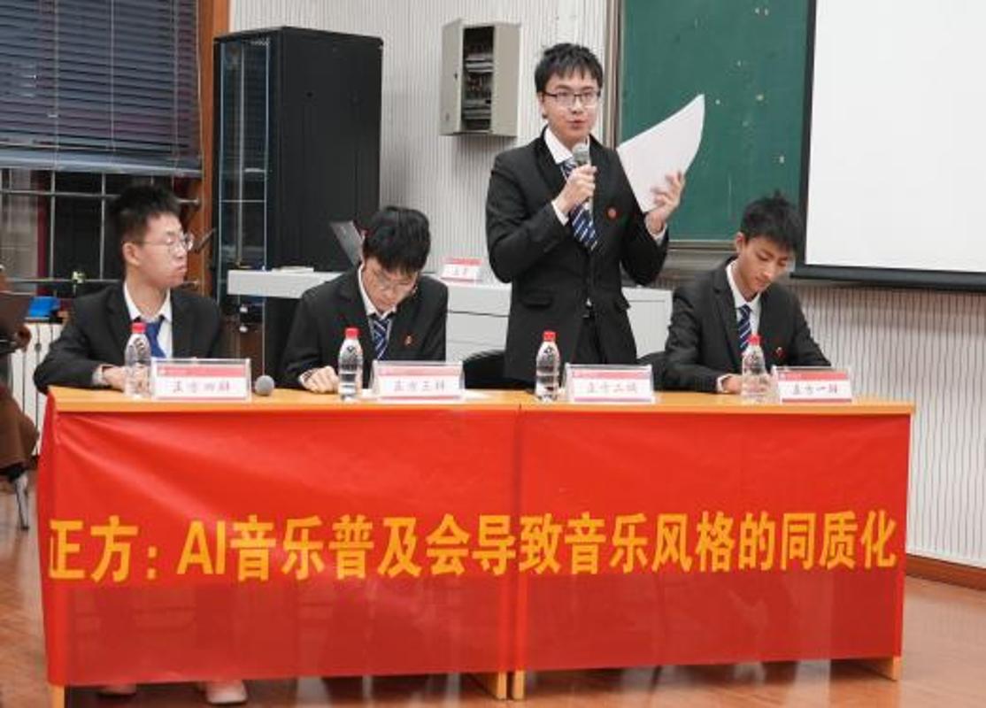上半场辩论聚焦“AI音乐普及会/不会导致音乐风格的同质化”这一议题。正方辩手段承佑、文睿、罗文楷、范子翔与反方辩手白景宇、屠文宇、陈宇轩、吴忧展开了激烈交锋。正方从AI打破音乐创作壁垒、为多元表达提供支撑的角度出发,论证技术普及将推动音乐风格更加多元;反方则聚焦算法的趋同性与流量导向的影响,提出AI可能导致音乐创作出现套路化倾向。双方辩手引经据典、逻辑清晰,在开篇立论、质询驳论、自由辩论、总结陈词等环节层层递进,展现了扎实的思辨能力。