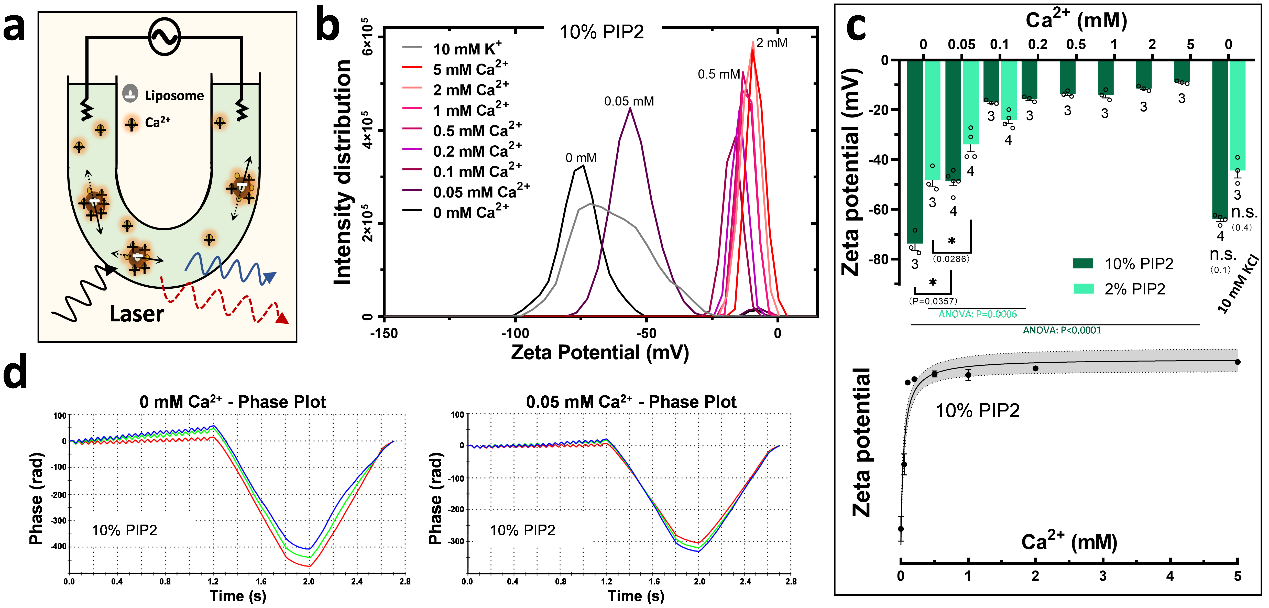 由于CaT-Syts不具备Ca2+亲和性,为了探究Ca2+抑制其膜结合的分子机制,研究团队猜测Ca2+可能通过与膜磷脂的相互作用来抢占Syts的结合位点。利用电泳光散射(ELS)检测Ca2+对脂质体(Φ 400 nm)表面静电势的影响发现,50 μM Ca2+足以大幅度地提升脂质体的Zeta电位。这表明Ca2+可被磷脂膜组成成份PIP2头部的磷酸基团螯合,从而屏蔽磷脂膜表面的静电荷,抑制CaT-Syts与质膜的结合。