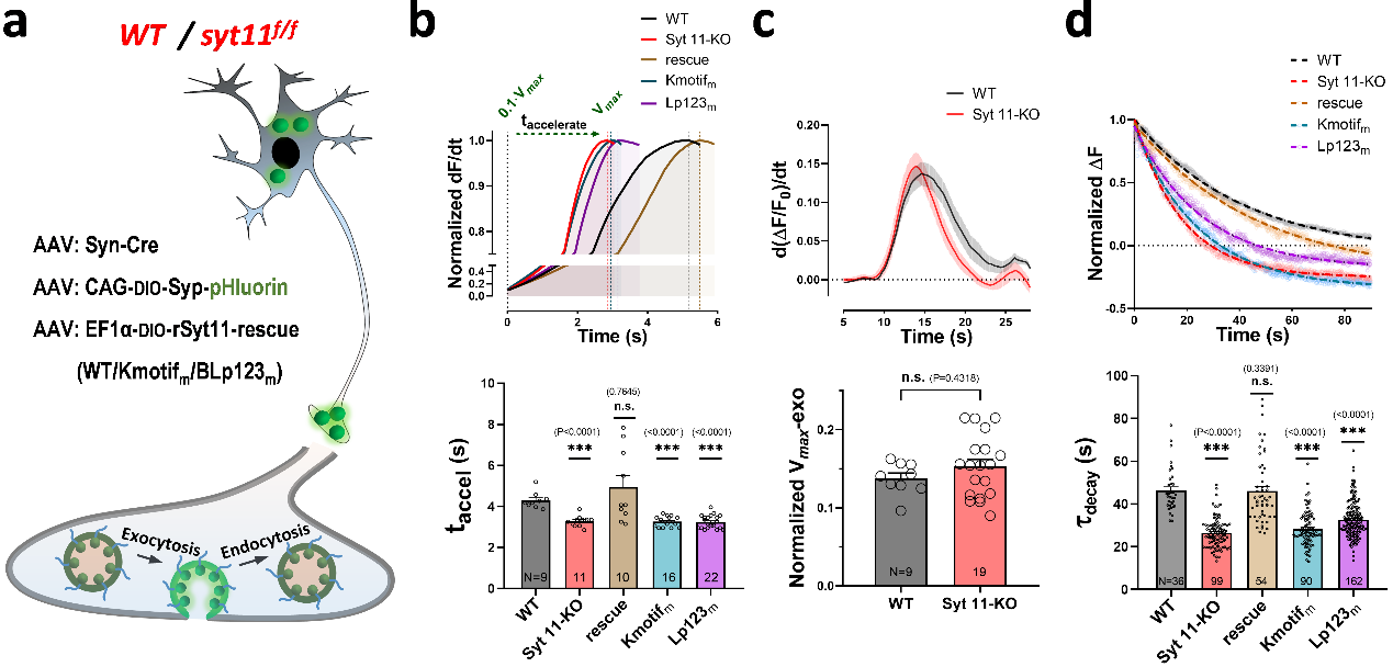 为验证Syt11对突触囊泡胞吐-胞吞的动态调控,研究团队通过小鼠原代皮层神经元突触的Syn-pHluorin荧光成像发现,Syt11敲除(KO)后,胞吐的加速阶段(从胞吐开始到最大胞吐速率)时间缩短,而K-motif及loop-123突变体无法回补KO效果,表明Syt11可抑制早期胞吐事件,且此作用依赖于其膜结合能力;同时,Syt11 KO并不影响最大胞吐速率,表明此阶段(胞内Ca2+浓度达最大值)Syt11抑制解除、并不参与其胞吐调控;有趣的是,Syt11 KO还显著加速胞吐后的囊泡内吞过程,表明Ca2+对Syt11的抑制作用解除,Syt11与质膜的互作得以恢复,进而抑制囊泡胞吞过程。这些结果表明,Syt11对囊泡胞吐-胞吞的调控是阶段性的、受胞内Ca2+水平实时动态调控,进而建立了Ca2+依赖性的Syt11-Syt1质膜结合动态切换模型,揭示神经元兴奋-分泌动态偶联的分子基础与调控机制。