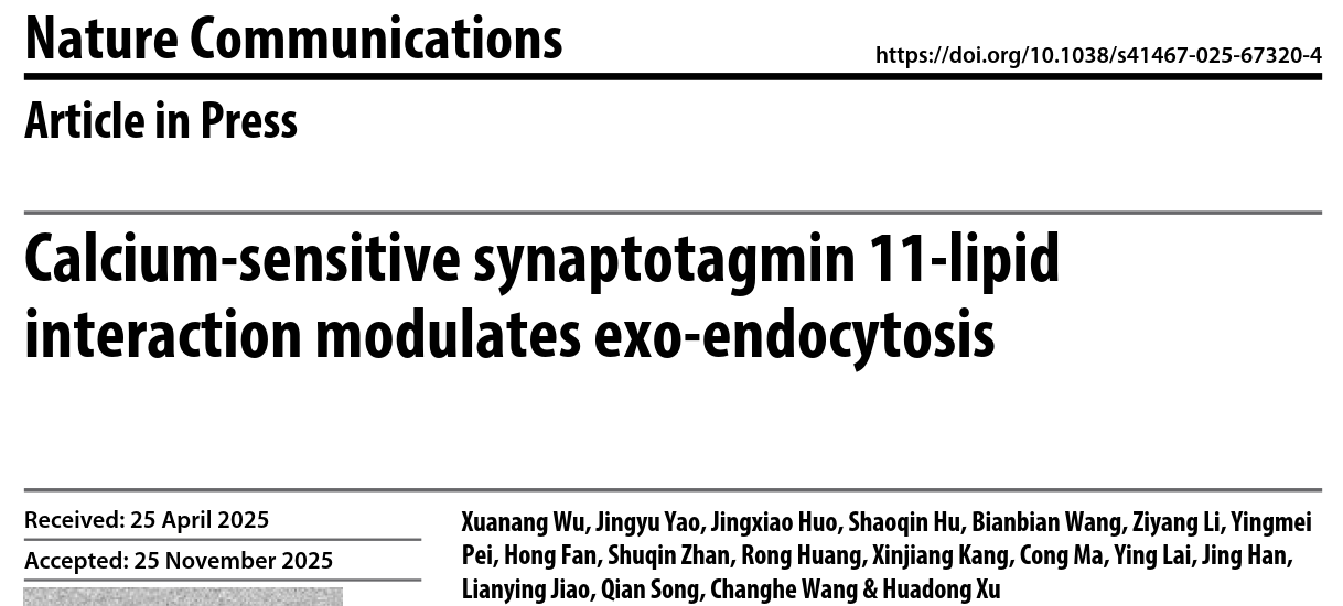 12月16日,该研究成果以《钙敏感型突触结合蛋白11与脂质的相互作用调节胞吐-胞吞过程》(Calcium-sensitive synaptotagmin 11-lipid interaction modulates exo-endocytosis)为题发表在《自然通讯》(Nature Communications)上。西安交通大学生命学院及生物医学信息工程教育部重点实验室为该论文的第一作者单位和通讯作者单位。生命学院徐华栋副教授、王昌河教授、宋茜副教授、基础医学院焦联营教授为该文共同通讯研究团队。生命学院博士生吴轩昂、姚靖宇、霍靖骁为论文共同第一研究团队。西安交通大学分析测试中心工程师马亚云、甘明明协助了ELS数据的采集。西安交通大学博士毕业生胡亚冲、刘彦玲博士为本工作提供了宝贵意见与帮助。本研究得到国家自然科学基金、陕西省自然科学基金、三秦英才特殊支持计划创新创业团队、陕西省重点研发计划、陕西省博士后基金等项目资助。