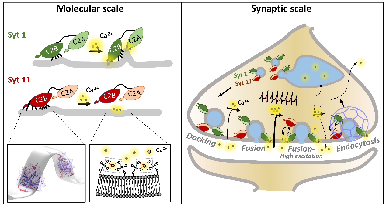 该研究工作首次揭示Syt11通过钙敏感的膜结合行为参与神经分泌调控,突破了“只有钙结合型Syt才受钙调控”的传统认知,阐明了Syt1与Syt11分别与质膜Ca2+敏感性结合的分子基础,提出了“CaR-Syt与CaT-Syt膜占位切换”理论模型,不仅为突触传递中 “兴奋-分泌”偶联和“胞吐-胞吞”偶联提供了新理论,还为理解神经分泌异常相关疾病的病理机制提供了新视角与新思路。