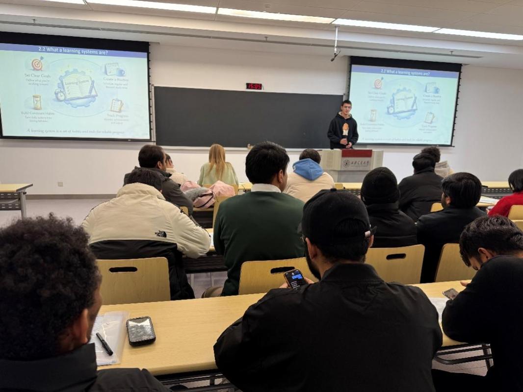 讲座中,艾达尔生动剖析了国际学生在学业与生活中常见的困惑,如初期学习方向不明,进步感缺失,易与他人比较等心理状态,并提供了切实可行的应对策略。他强调,方向往往是通过行动逐渐清晰的,并非事先完全规划好的。在分享学习方法时,他提出建立可持续的学习系统比依赖短暂动机更为重要,小而持续的积累远胜于偶尔的高强度投入等观点,引发了在场学生的强烈共鸣。