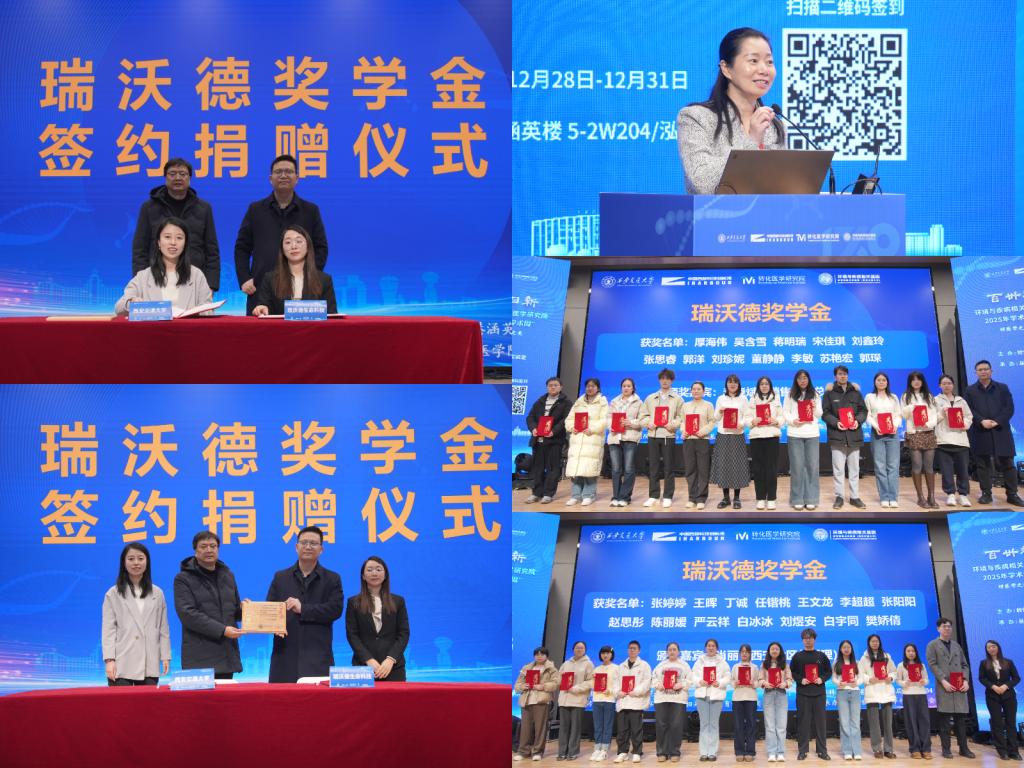 颁奖环节由基础医学院党委副书记陈莉娜教授主持,会上首先进行了瑞沃德奖学金签约捐赠仪式。瑞沃德奖学金由瑞沃德生命科技有限公司设立,已经连续九年资助基础医学院学生,旨在激励在学业、科研及社会实践等诸多领域均展现卓越风采的学子。西安交通大学教育基金会秘书长助理毛珊与瑞沃德西安大区总经理肖丽共同签约,瑞沃德销售中心总监李晓斌与基础医学院党委书记李峥嵘共同见签,同时为26名研究生颁发瑞沃德奖学金证书,勉励他们再接再厉,勇攀学术高峰。