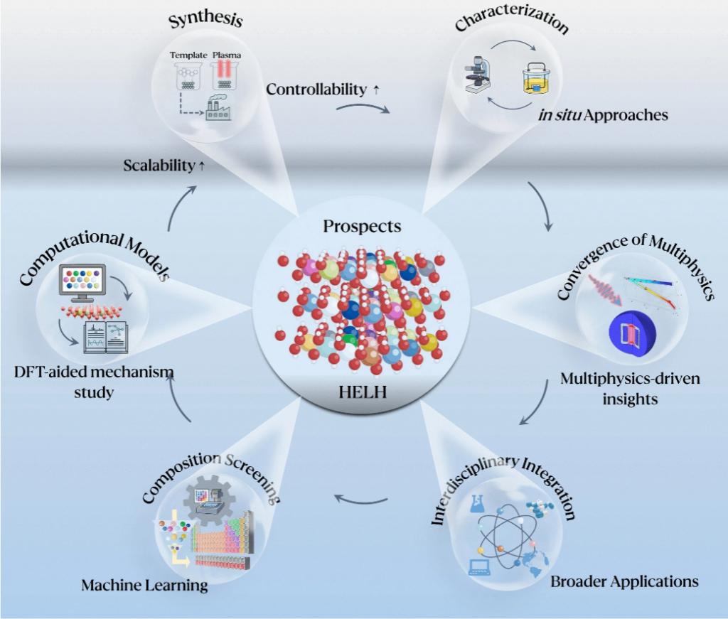 文中系统总结了HELHs的先进合成策略——如等离子体辅助水热法,实现了对材料微观结构的精确调控与宏量制备的协同推进,深入剖析了其在高熵环境下的功能机制,尤其是在析氧反应(OER)、水氧化、析氢反应及葡萄糖电氧化等关键反应中表现出的卓越电化学性能。此外,团队还前瞻性探讨了该类材料在生物医学传感、药物递送等跨学科领域的应用潜力。面对当前HELHs研究仍存在的合成可控性、构效关系不明确及跨领域应用衔接不足等挑战,郗凯团队提出未来应结合原位表征技术与多尺度模拟,融合机器学习方法以加速组分优化与性能预测,并通过强化学科交叉推动HELHs迈向功能化、系统化与产业化。该综述不仅为高熵层状氢氧化物的基础研究与工程应用提供了清晰的技术路线图,也彰显我国在新材料原始创新与前沿科技探索中日益提升的国际影响力,为实现能源、生物医疗等关键领域的材料自主研发与技术突破奠定了坚实的理论与实验基础。