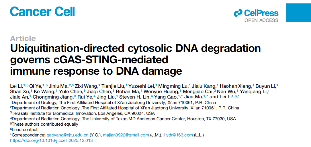 近日,西安交通大学第一附属医院李磊、马坚、高杨团队在国际肿瘤学顶级期刊《癌细胞》(Cancer Cell)上发表了题为 “Ubiquitination-directed cytosolic DNA degradation governs cGAS-STING-mediated immune response to DNA damage”(《泛素化介导的胞质 DNA 降解决定了 cGAS-STING 介导的 DNA 损伤的免疫反应》)的研究论文。该研究聚焦放疗联合免疫治疗临床效果不佳这一关键问题,揭示了肿瘤细胞对放疗诱导免疫激活的内在调控方式,为理解部分患者对放射免疫治疗不敏感提供了重要依据以及新的治疗策略。