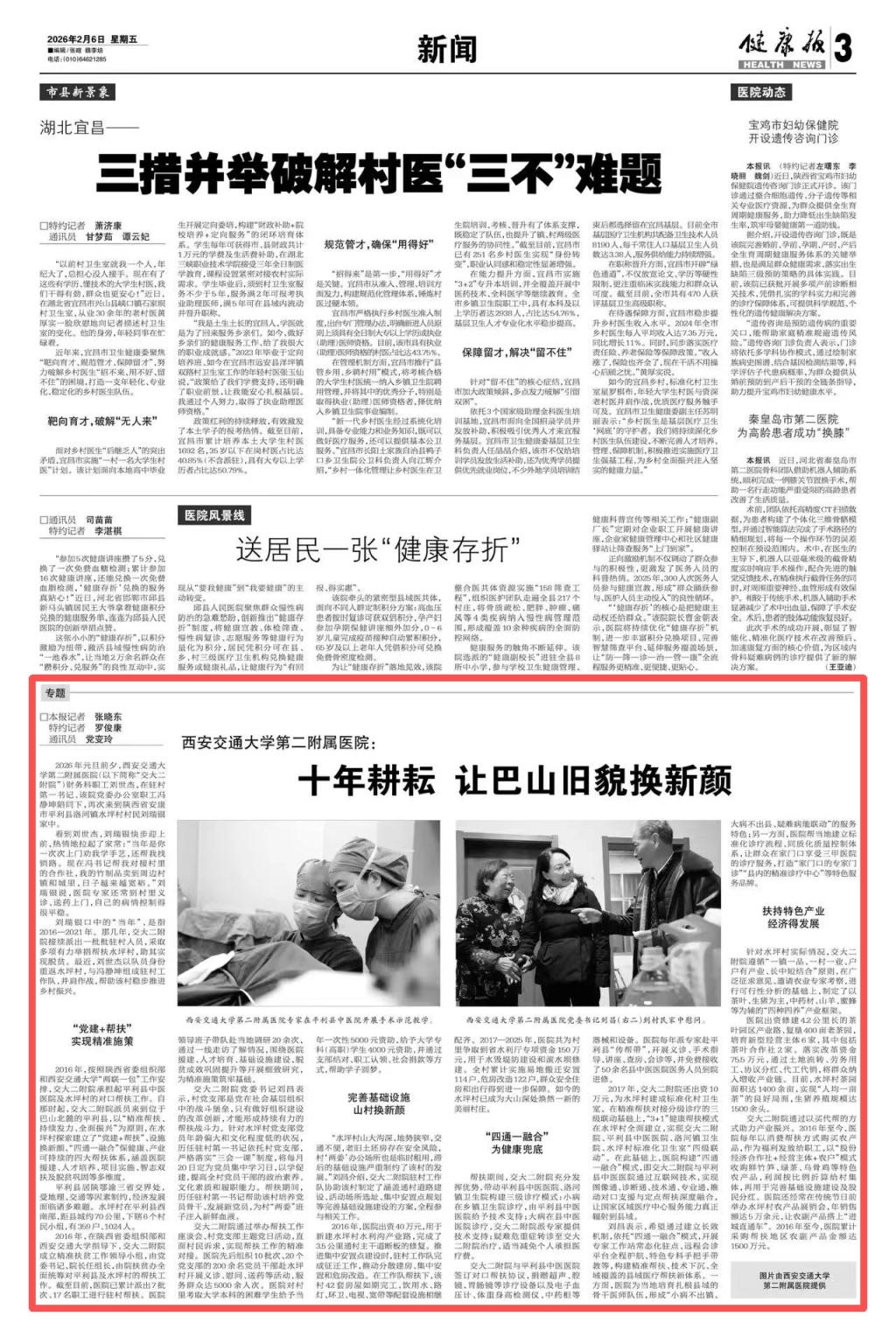 2017年,交大二附院还出资10万元,为水坪村建成标准化村卫生室。在精准帮扶对接分级诊疗的三级联动基础上,“3+1”健康帮扶模式在水坪村全面建立,实现交大二附院、平利县中医医院、洛河镇卫生院、水坪村标准化卫生室“四级联动”。在此基础上,医院构建“四通一融合”模式,即交大二附院与平利县中医医院通过互联网技术,实现图像通、诊断通、技术通、专业通,推动对口支援与定点帮扶深度融合,让国家区域医疗中心服务能力真正辐射到县域。