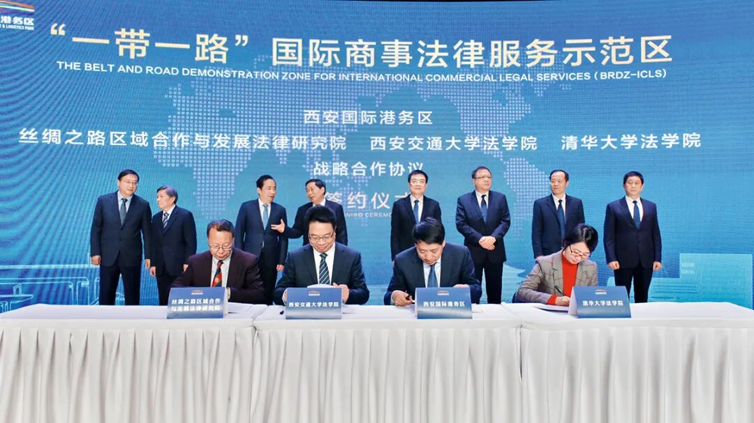 2020年,单文华首倡的“‘一带一路’国际商事法律服务示范区(中央法务区)”在西安揭牌成立,单文华(前排左二)代表西安交通大学法学院签署共建协议