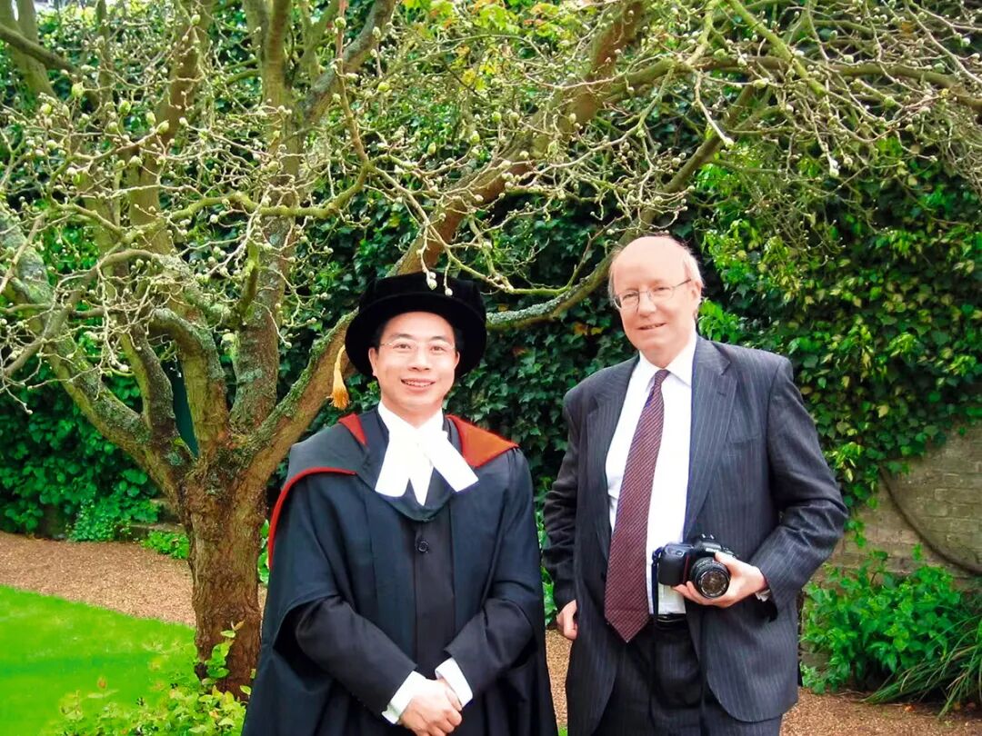 2004年,单文华(左)参加博士毕业典礼后,和时任英国剑桥大学法学院院长Kevin Gray教授在圣三一学院“牛顿苹果树”下合影