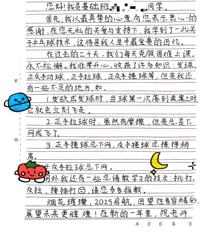 受助学生们在信中这样写道,“在教练们的倾囊相授下,我学会了发球、攻球、搓球等技术。感谢此次训练营活动给予我学习机会,这将是我人生中一段宝贵的回忆。”“在市运会期间,我就曾在赛场上接受刘老师指导,如今有幸能够在训练营与老师再度结缘,此次活动不仅减轻了家庭的负担,也让我更加有信心学好乒乓球,我要用我的成长回报老师的爱心。”另一名受助学生这样说道。