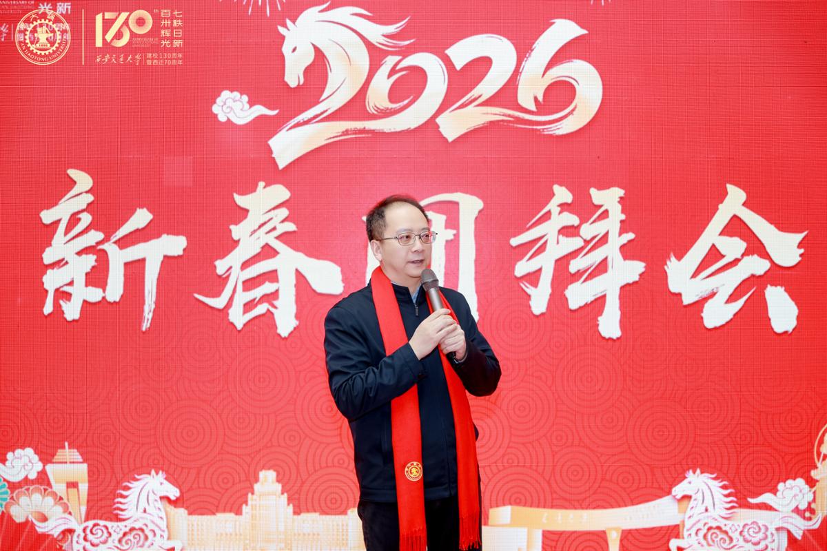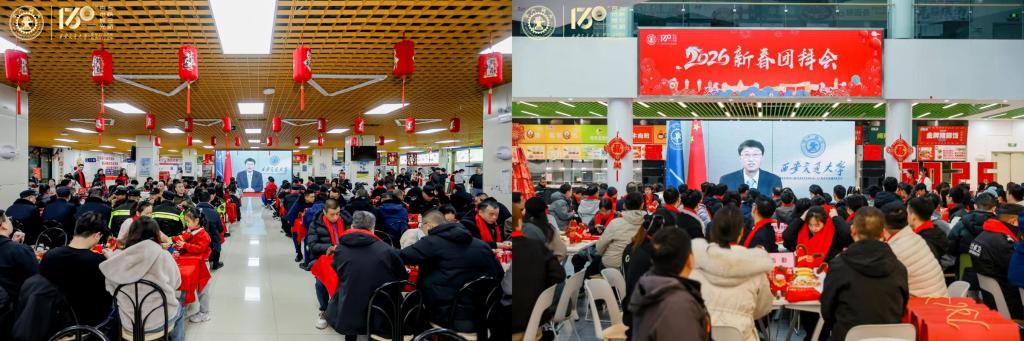 金蛇辞旧岁,玉马踏春来。2月16日,农历腊月廿九(除夕)当天,西安交通大学2026年新春团拜会在兴庆校区梧桐苑和创新港同和苑同步举行。校党委常委、副校长柴渭,校党委副书记王欢,以及学工部,研工部,国际教育学院,团委,后勤保障部,保卫处,各书院、学院负责人,与寒假留校的学子们欢聚一堂,共品团圆饭,喜迎新春佳节。校园内外,红灯笼高挂,福字映窗,处处洋溢着喜庆温馨的节日氛围。